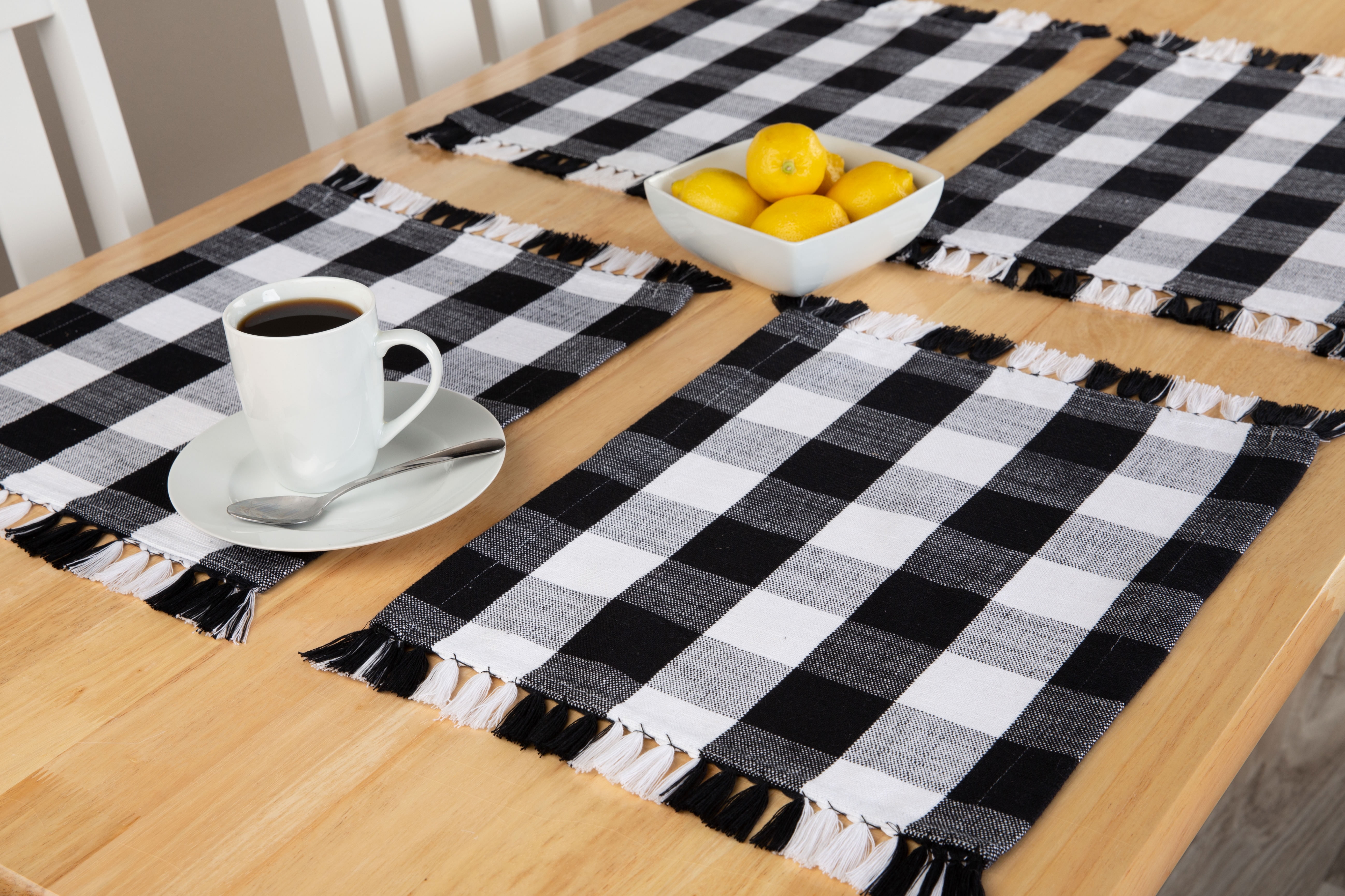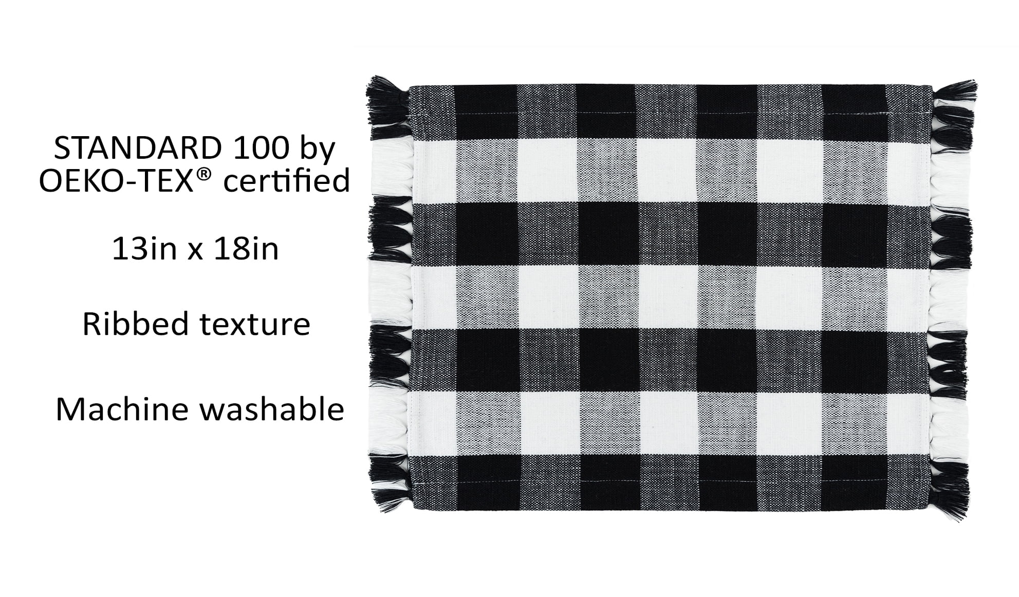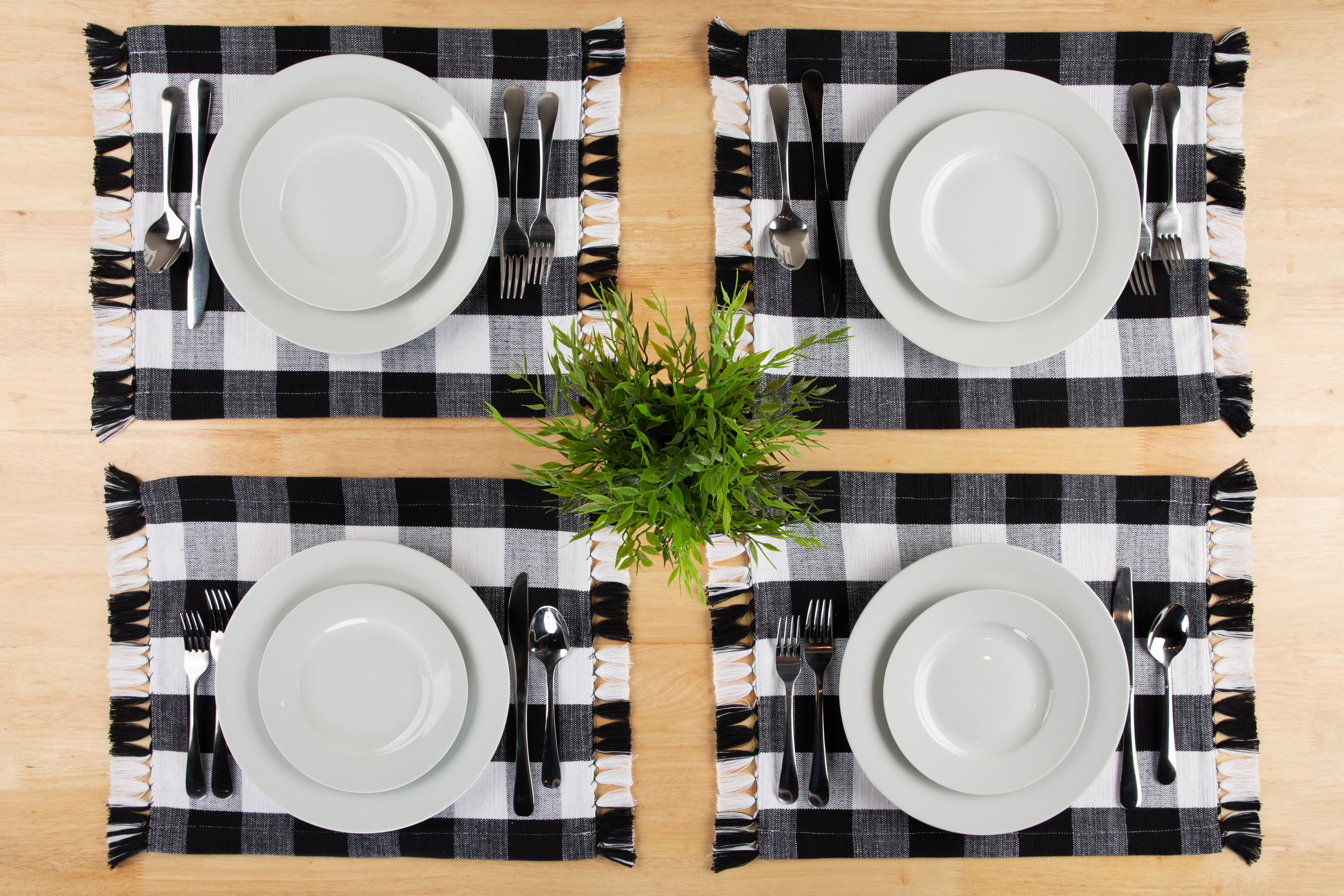 The Mainstays Buffalo Plaid Placemat is the perfect way to dress your table to make the spirit of the season come alive year after year or enjoy every day throughout the year. With a classic plaid design in white and black, this placemat coordinates with a variety of dining items including table runners and napkins to complete your table setting. Constructed of a cotton material for extra durability and easy care, the Buffalo Plaid Placemat is the perfect way to decorate your dining room table. Set your table for special occasions, holiday parties, seasonal entertaining, or everyday dining. Available in common size to fit your table at 14 in x 19 in rectangle and sold separately so you can purchase the exact right quantity for your table. The lovely Buffalo Plaid Placemat is easy to care for: just machine wash cold with like colors. Delicate cycle. Do not bleach. Remove promptly. Lay flat to dry. Warm iron when needed.
