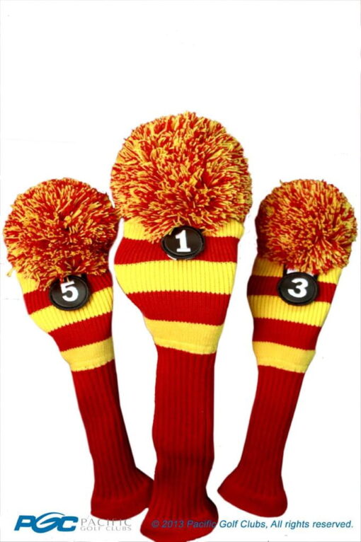 Golden Yellow and Red Knit Spandex Pom Pom Head Cover Set. Includes: Driver, #3 wood head cover and #5 wood head cover.