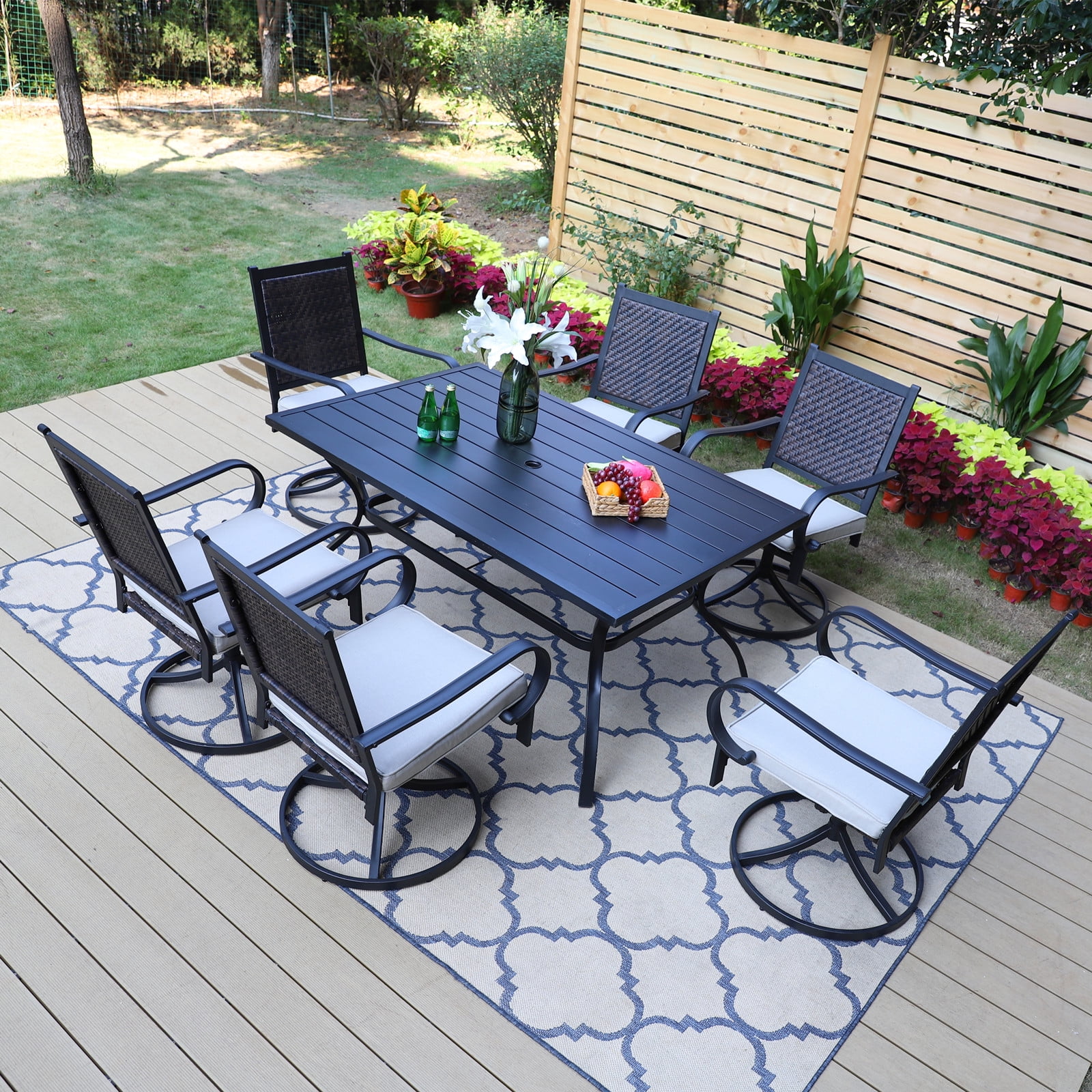 The set includes one square dining table, one 13 ft umbrella and six cushioned chairs. Made of high-quality steel frame with E-coating & powder coated finish and tightly hand-woven PE rattan, it offers supportive structure and stands up to outdoor elements for reliable long-lasting strength. Featuring clean lines and hand crafted resin wicker that lends this dining chair a warm, inviting feel which is elegant and stylish in your garden or yard. The upholstered cushion, premium rattan back & smooth powder-coated armrests give plenty of support & comfort. The fabric of cushion is stain & water-resistant which is removable for easy cleaning and recovering. The 13 ft double-sided patio umbrella is assembled onto the table top that offers an easy, fast and efficient shade solution, protecting your family/friends away from the harmful UV rays. The umbrella consists of 12 reinforced ribs and 1.5" diameter pole which has a strong frame and made of durable 180 G polyester fabric, it provides with up to 99% UV protection, water-proof and fade-proof perfectly.