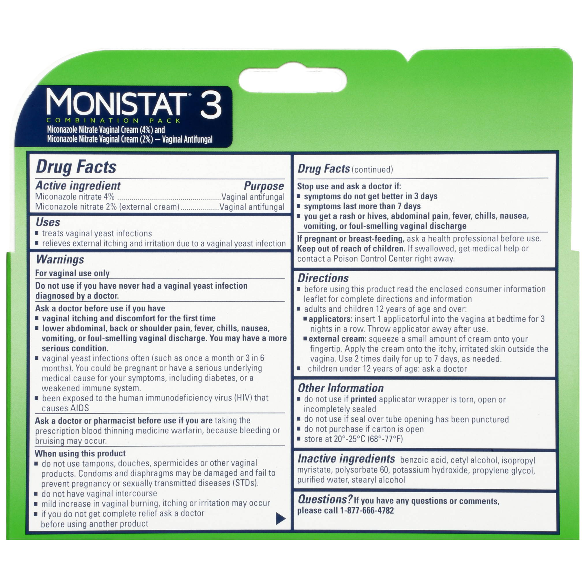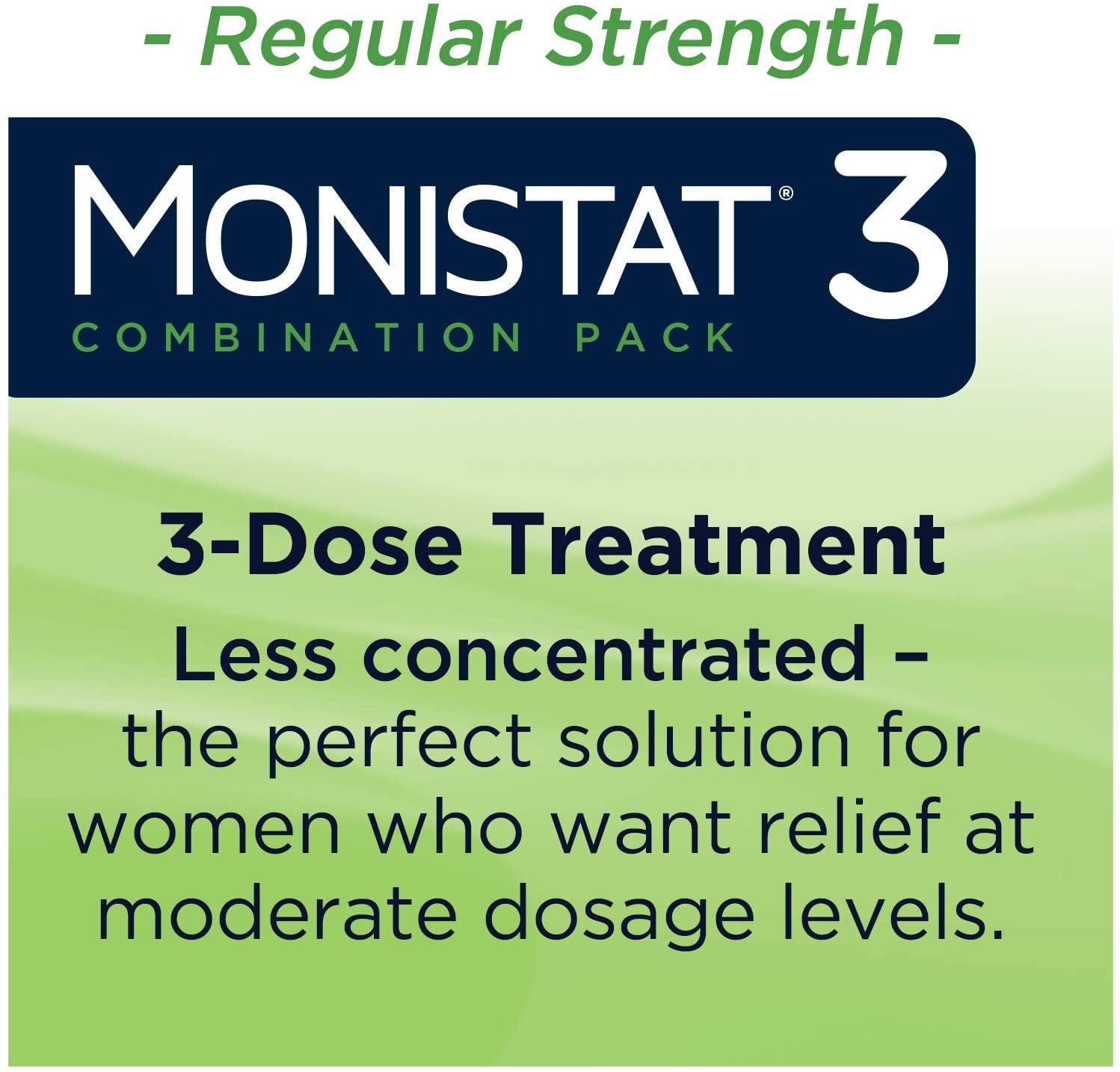 MONISTAT 3-Dose Yeast Infection Treatment is a great regular strength nighttime option for women who want a less concentrated treatment at moderate dosage levels. This combination pack contains 3 ready-to-use applicators prefilled with cream along with 1 tube of external itch cream for symptom relief. Each prefilled applicator contains 200 mg Miconazole Nitrate to be used at nighttime. MONISTAT 3-Dose is clinically proven to be a safe and effective yeast infection treatment. MONISTAT is the Number One gynecologist-recommended brand (1) and starts working right at the site of infection. MONISTAT treats 5 of the most common types of yeast infections (2) and relieves symptoms 4x faster than the leading prescription pill (3). While MONISTAT products offer the most time-convenient yeast infection treatment course, most women do not experience relief from the infection in just 1 day. If you do not feel some relief within 3 days, or complete relief within 7 days, stop using the product and consult your healthcare professional. Feel better faster at home with MONISTAT. (1) According to the ProVoice Survey, MONISTAT is the Number One Gynecologist-Recommended Brand Over the Counter product in the Vaginal Anti-Fungal category in the US among OB/GYNs. (2) Miconazole treats more of the most common species responsible for vaginal yeast infections than fluconazole. (3) Based on clinical study of MONISTAT 1-Dose Ovule Combination Pack versus fluconazole 150 mg tablet.