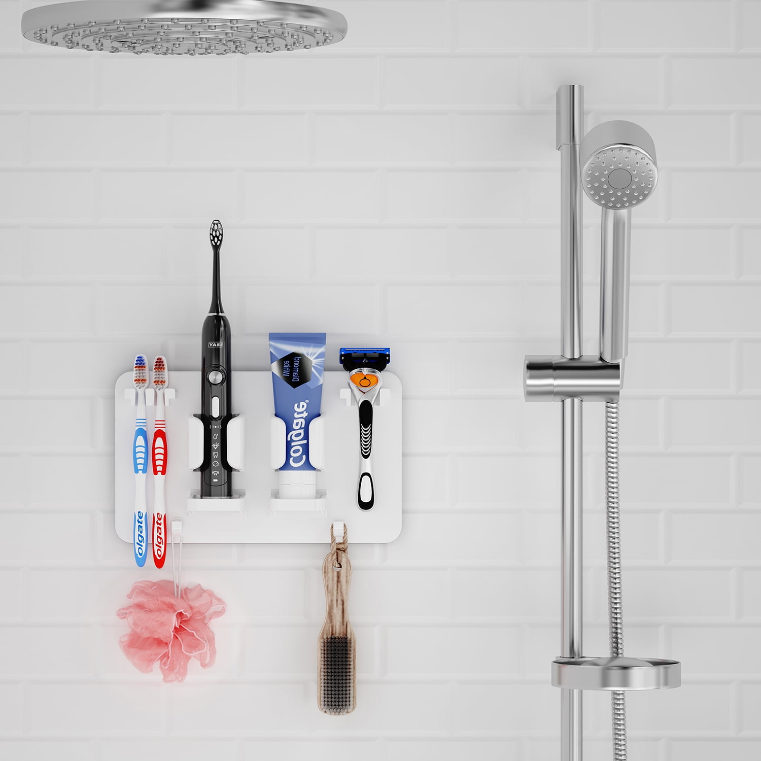 - Mighty Hanging Shelf – There are 2 hangers above the toothbrush holder, 2 large slots in the middle, and 2 hooks below. The upper two hangers can hang your electric toothbrush head, manual toothbrush or razor. The two large slots in the middle can fit your electric toothbrush, toothpaste, facial cleanser or electric shaver. The two lower hooks can hang your washcloth, towel, loofah, shower cap, cup with handle, etc.