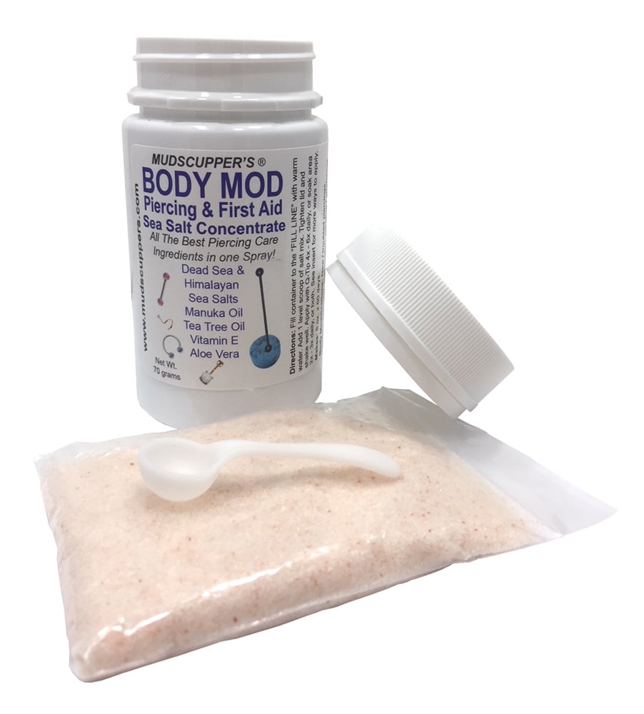 Mudscupper’s BODY MOD Salt Concentrate is #1 IN DIY Piercing Aftercare. All the best ingredients (East Cape Manuka & Tea Tree oils and Himalayan & Dead Sea Salts) in piercing aftercare are combined into this exceptional piercing aftercare product. This BODY MOD Salt Concentrate helps prevent the most stubborn piercing issues: discoloration, swelling, irritation. It is also known to shrink/remove piercing bumps for most people (often referred to as hypertrophic scars, topical cyst, and keloids). This product is made with 100% natural and FDA-approved ingredients.