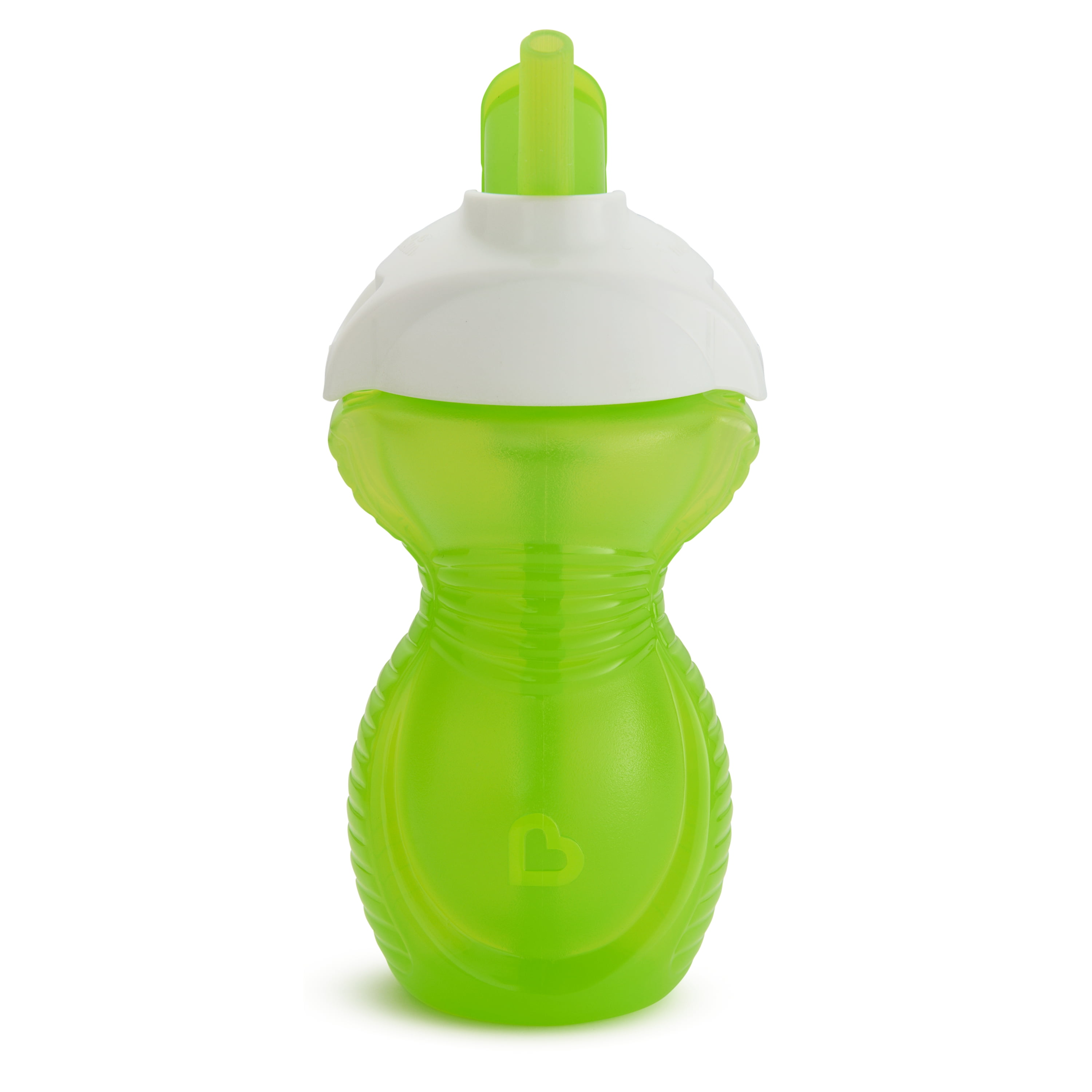 - Leak-proof toddler cup with a flip-top lid and flexible, silicone straw