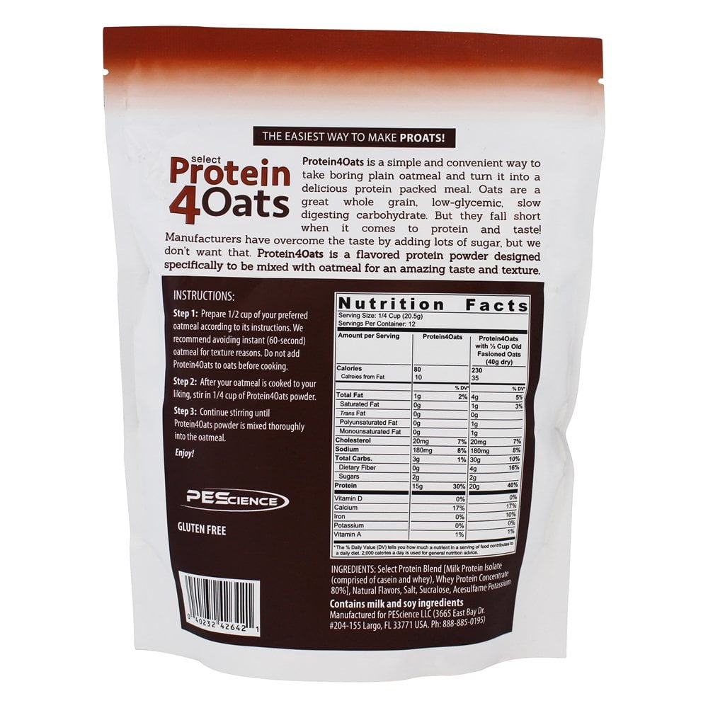 PEScience – Select Protein 4Oats Powder Maple Brown Sugar – 8.7 oz. (246 g) Physique Enhancing Science Select Protein Four Oats Powder powers up your oatmeal. Protein4Oats is a simple and convenient way to take boring plain oatmeal and turn it into a delicious protein packed meal. Oats are a great whole grain, low-glycemic, slow digesting carbohydrate. But they fall short when it comes to protein and taste! Manufacturers have overcome the taste by adding lots of sugar, but they don’t want that.