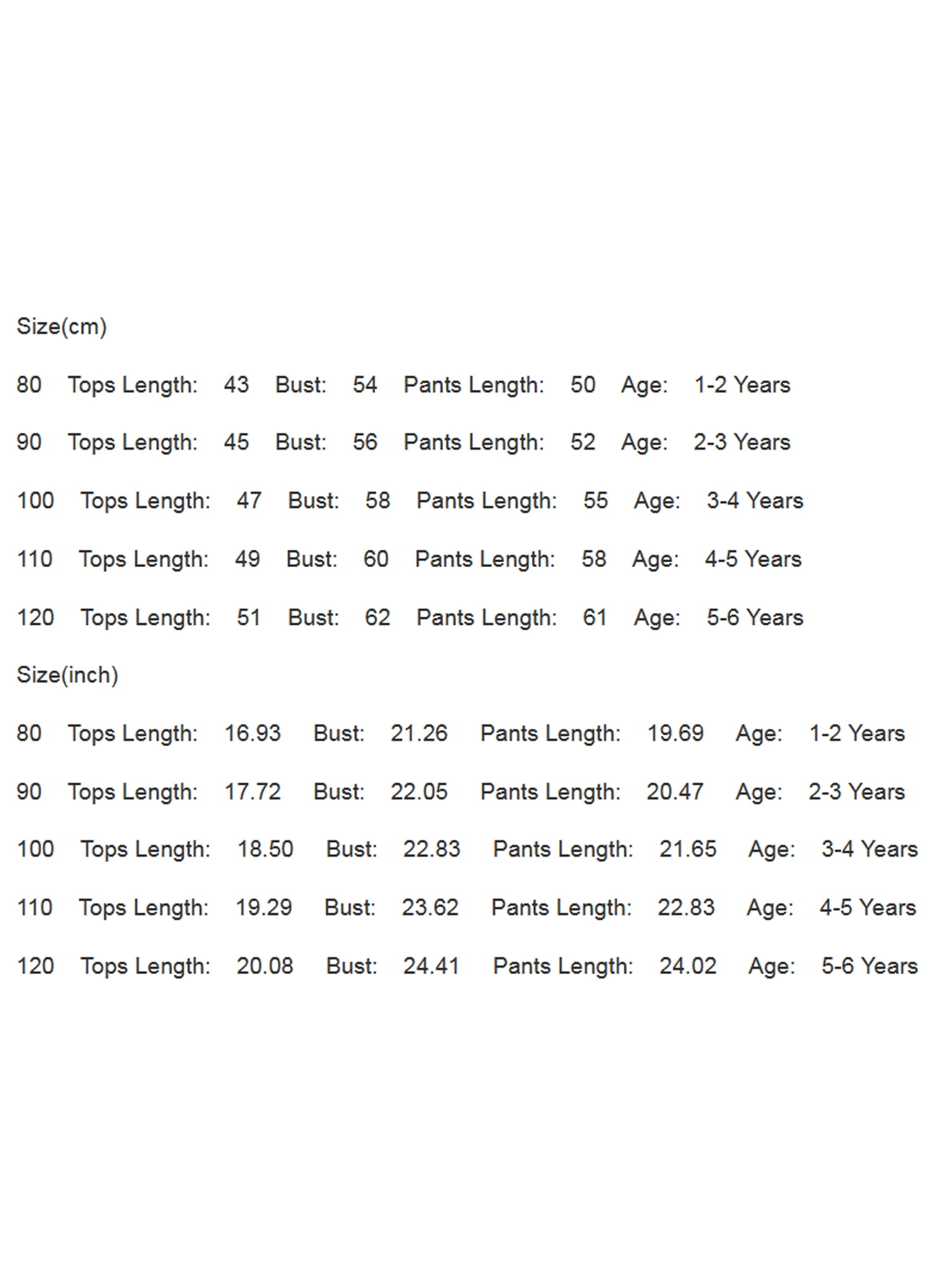 80 Tops Length: 11.81 Bust: 20.47 Shoulder: 8.94 Pants Length: 16.34 Waist: 15.75 Age: 6-9 Months