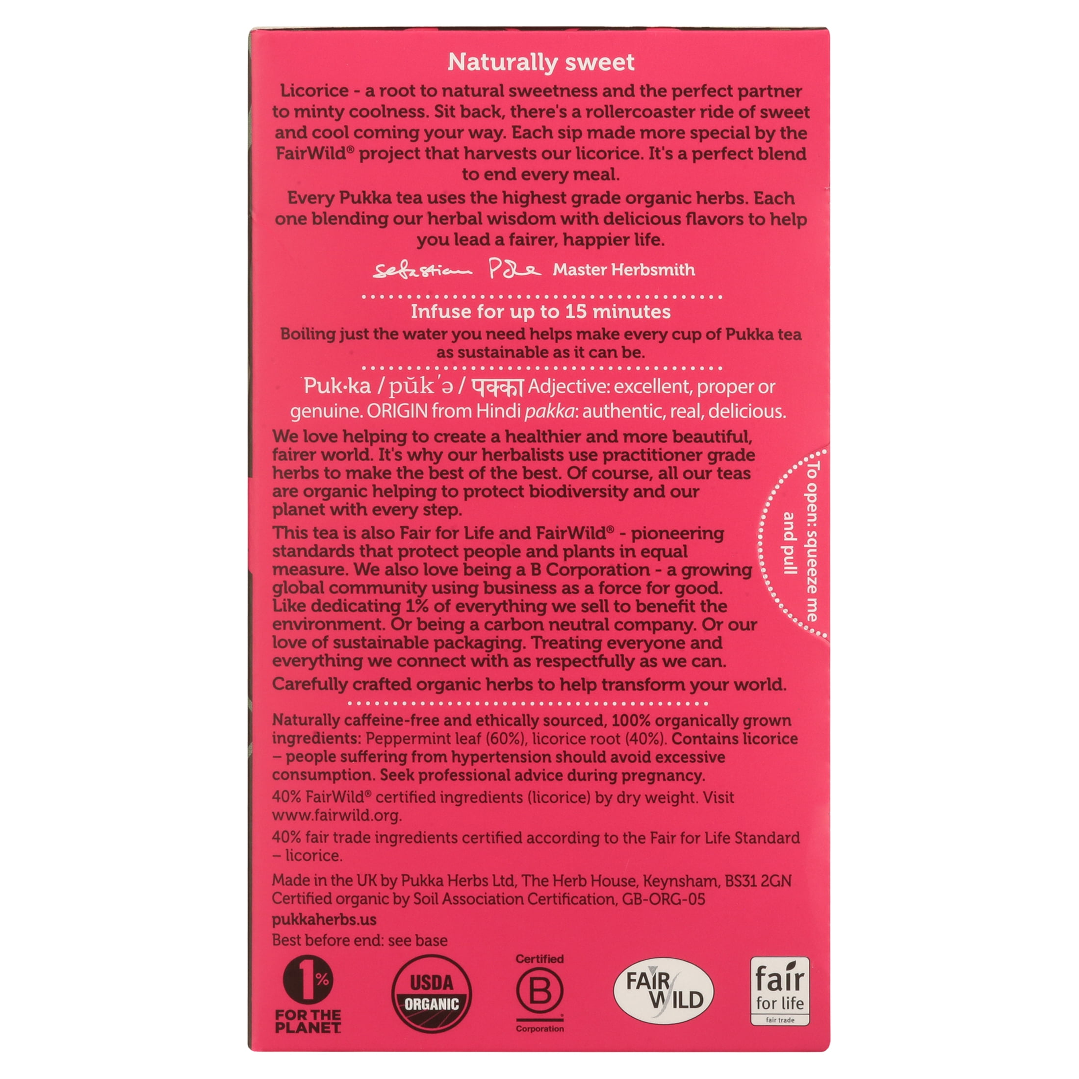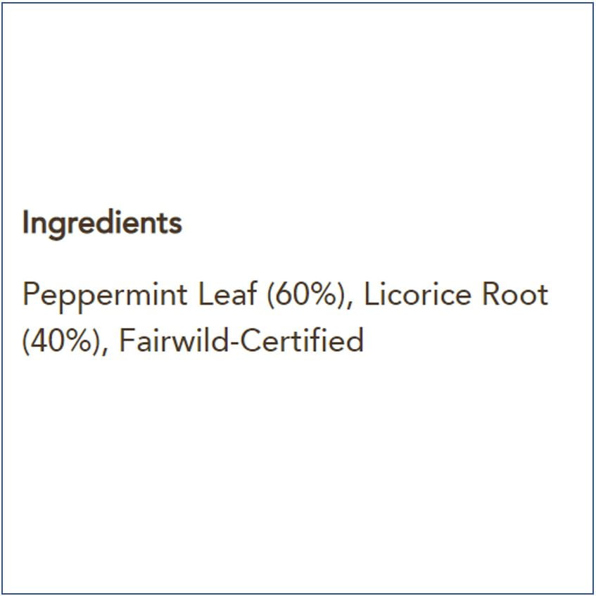 Thrills come in all shapes and sizes. Sit back, there’s a rollercoaster of sweetness coming your way. The natural joy of FairWild licorice root, the minty brilliance of fresh peppermint leaves – it’s nature’s perfect blend, carefully concocted to give your senses goose-bumps. Now just enjoy the ride. Every Pukka plastic-free tea bag comes in its own recyclable envelope to retain the essential oils in our organic herbs. Each bag has two chambers, allowing these incredible herbs to flow and release the full potency in your cup. To help the flavours to fully disperse, pour boiling water directly on the bag. Every herb loves the water, so leave them to steep for the perfect brew. Infuse for up to 15 minutes. Boiling just the water you need helps make every cup of Pukka tea as sustainable as it can be. Good news for a sweet moment of bliss. At Pukka, our heartfelt desire is to create a healthier, happier world through the incredible power of organic herbs. We hope you feel inspired to discover more about yourself and the beautiful planet on which we all live. Doing good things helps make good things happen. We create things that help you, help nature and everything in-between. It’s called conservation through commerce – striving to positively change the world for you, business and the planet. We are a B Corp organisation, Giving back 1% for the Planet, Fair for Life and FairWild certified. If you enjoy Peppermint & Licorice, why not discover, Mint Matcha Green, Mint Refresh, Three Fennel, Three Mint, Feel New.