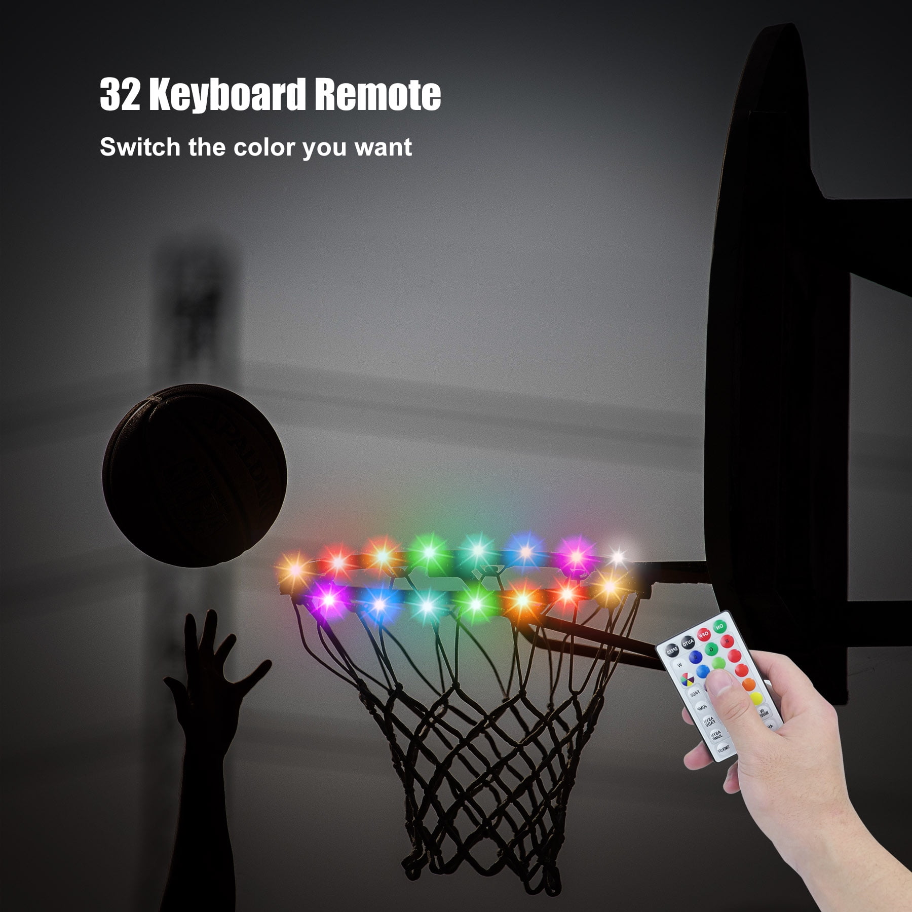 - 32-Key Remote Control: The LED basketball hoop light have a variety of colors and lighting modes, which bring you a different visual experience, the remote control controls 17 unique light colors (red, blue, white, purple, green, pink, etc.), 7 light flashing modes ( FADE, JUMP, ASYN FADE, ASYN JUMP, IN WAVES, STROBE TWINKLE), change the color of the basket as you like, and enjoy the fun of playing basketball at night.
