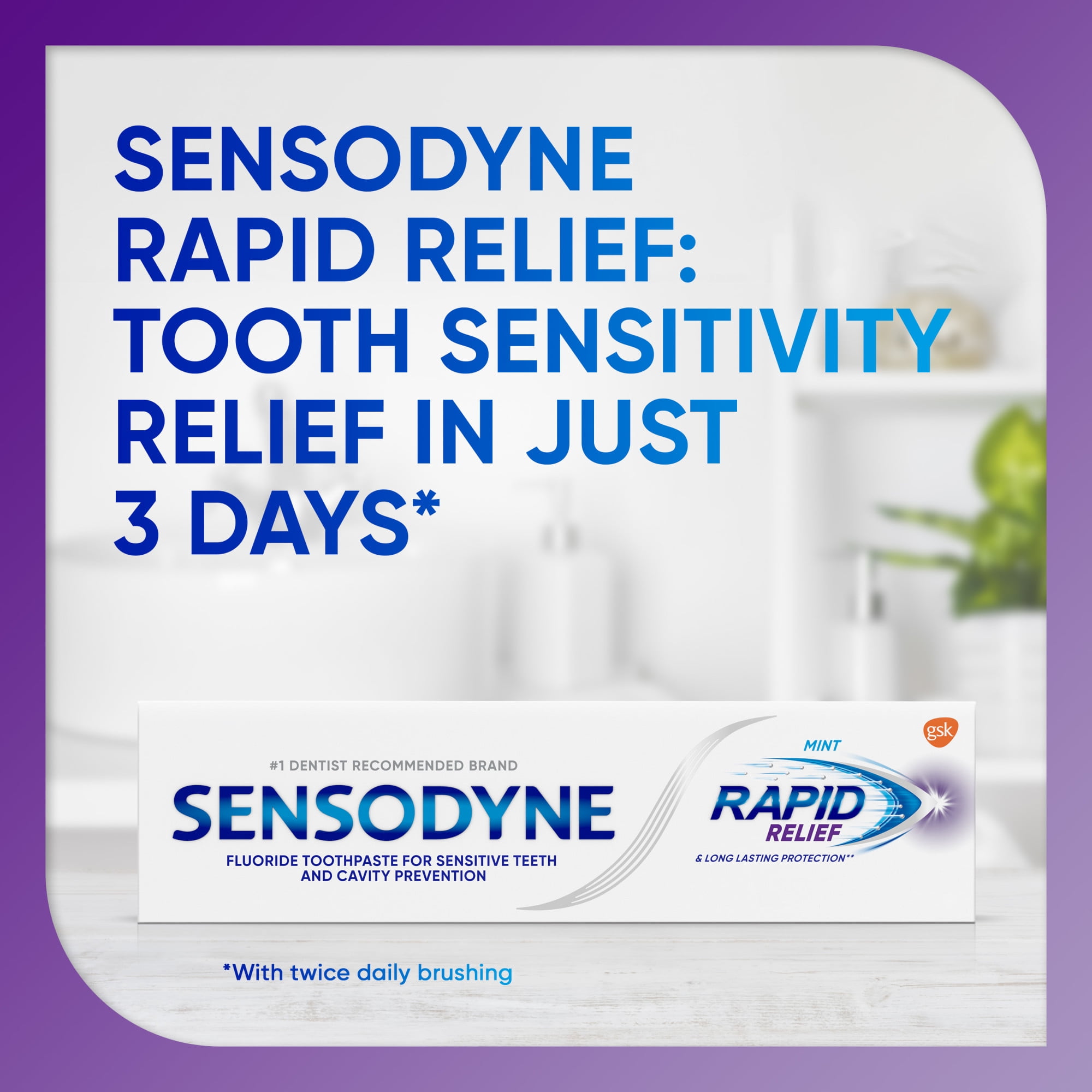 Sensodyne Rapid Relief Sensitive Toothpaste beats sensitivity pain fast, offering significant sensitivity relief in just three days with twice daily brushing. Specially formulated to build a protective layer over your exposed dentin, this stannous fluoride toothpaste builds resistance to sensitivity triggers such as contact with cold, hot, acid or sweet substances. Delivering all the benefits of regular anticavity toothpaste, Sensodyne toothpaste for sensitive teeth also prevents cavities and leaves you with fresh breath. This mint toothpaste conveniently comes in a travel size within TSA requirements, making it easy to take with you. Brush with this sensitivity toothpaste for two minutes, twice daily. Get lasting protection from tooth sensitivity with Sensodyne.