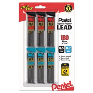 Smoother and stronger than the competition. Proprietary lead formula resists breaking. Dark imprint is ideal for drawing, while light imprint is ideal for drafting and template work. HB lead is equivalent to a 2 pencil and is guaranteed to accurately scan on tests and documents. Pencil Lead Format: Tube Lead Diameter: 0.5 mm 0.7mm Lead Degree Hardness: HB Lead Color: Black. Green : Packaging contains 100% total recycled content.Super Hi-Polymer Lead Refill Value Pack