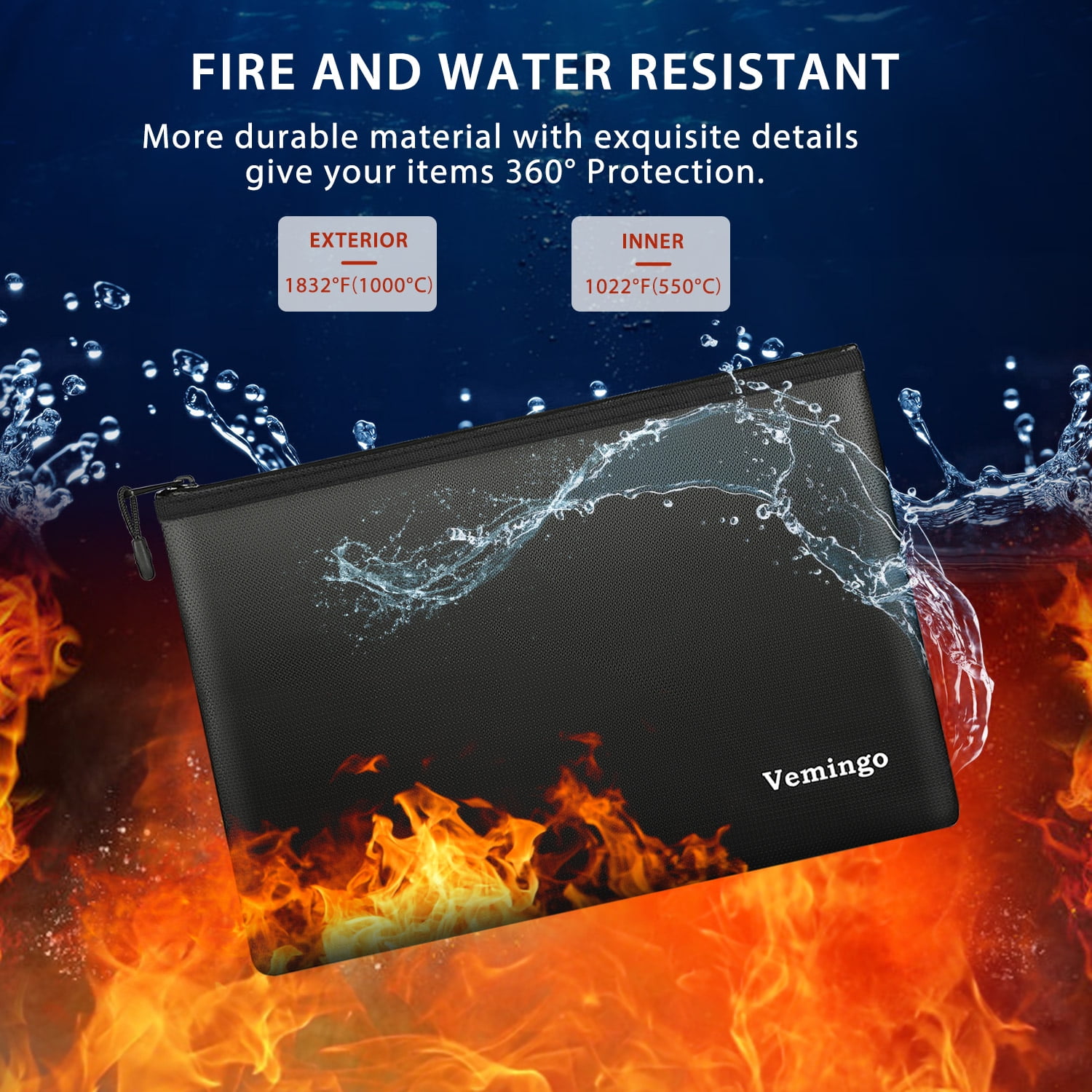 - [Fireproof Bag Waterproof] Vemingo fireproof bag document bag not only can withstand fire, but also are highly water-resistant even if they get wet for some reason. For the greatest protection, store in a lower level of your room.