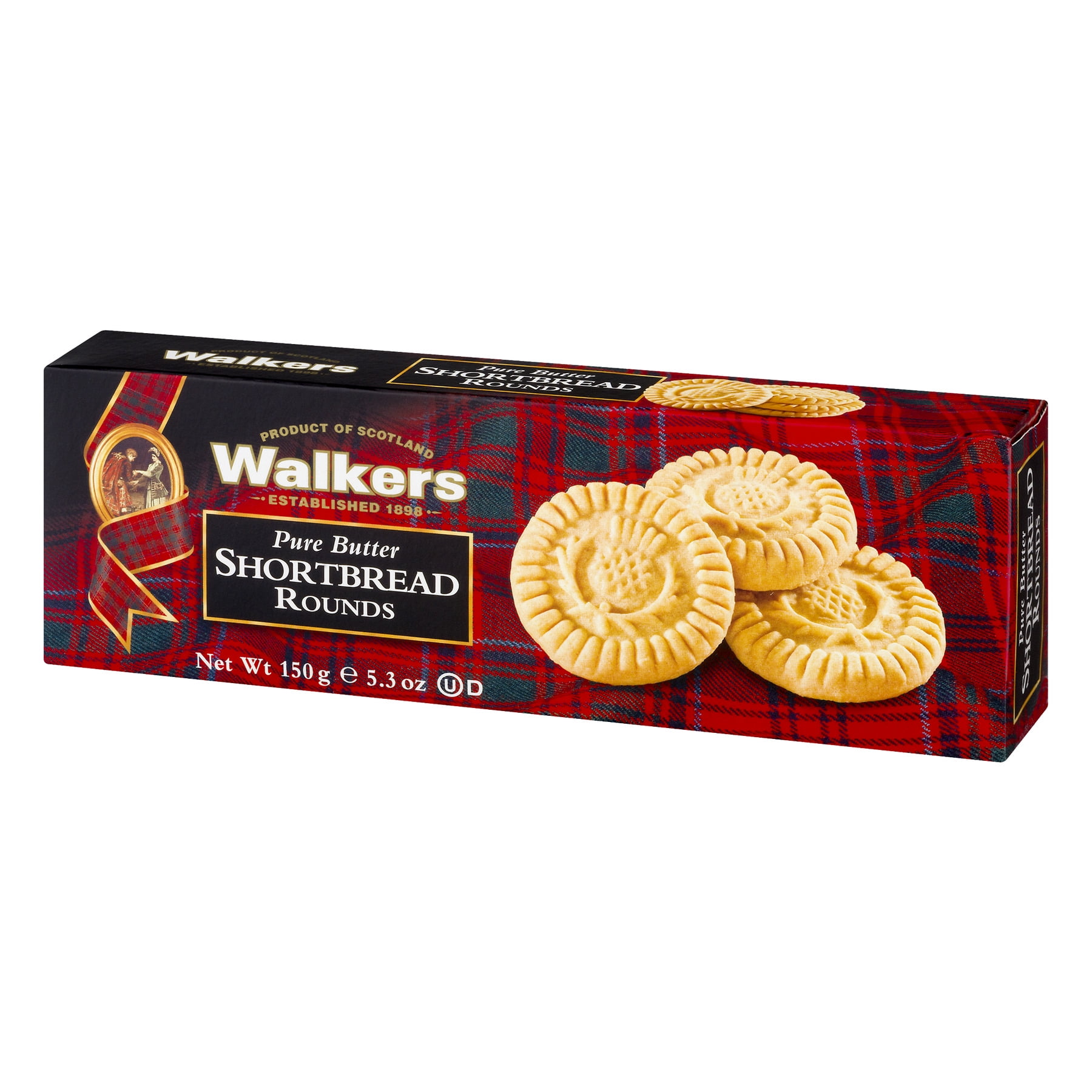 Shortbread, Rounds, Pure Butter, Box 5.3 Oz. Established 1898. Look for special offers inside! Pure Butter Shortbread Rounds: Walkers Pure Butter Shortbread is baked in the secluded village of Aberlour, Speyside, in the heart of the Scottish Highlands. The shortbread proudly features the Scots Thistle, long recognized as the National Emblem of Scotland. The shortbread is produced to a traditional recipe which has been handed down through generations of the Walker family. Walkers personally guarantee that this product is made using only the finest ingredients possible to obtain and contains no artificial colors, flavorings or preservatives. For information contact Walkers Shortbread Inc. between 9:00 am – 4:30 pm EST: 1 800 521 0141. www.walkersshortbread.com. Suitable for vegetarians. Product of Scotland. Store in a cool dry place. Contains: milk, wheat, gluten. May contain tree nuts. 5.3 Oz. (150 g) Aberlour-on-Spey AB38 9PD 800-521-0141These traditional rounds, now with a new thistle design, are miniature versions of the larger cakes of shortbread produced in olden days – with a rich distinctive buttery taste.This luxury Shortbread is baked in the secluded village of Aberlour, Speyside, in the heart of the Scottish Highlands.The shortbread is produced to a traditional recipe which has been handed down through generations of the Walker family who personally guarantee that this product is made entirely with creamery butter and the finest ingredients possible to obtain and contains no artificial colors, flavorings or additives.Perfect accompaniment to tea or coffee. Ideal with ice cream or desserts.Each box contains 9 Shortbread Rounds.Walkers Shortbread Rounds Pure Butter.Established 1898.Net Wt 150 g e 5.3 Oz.Kosher