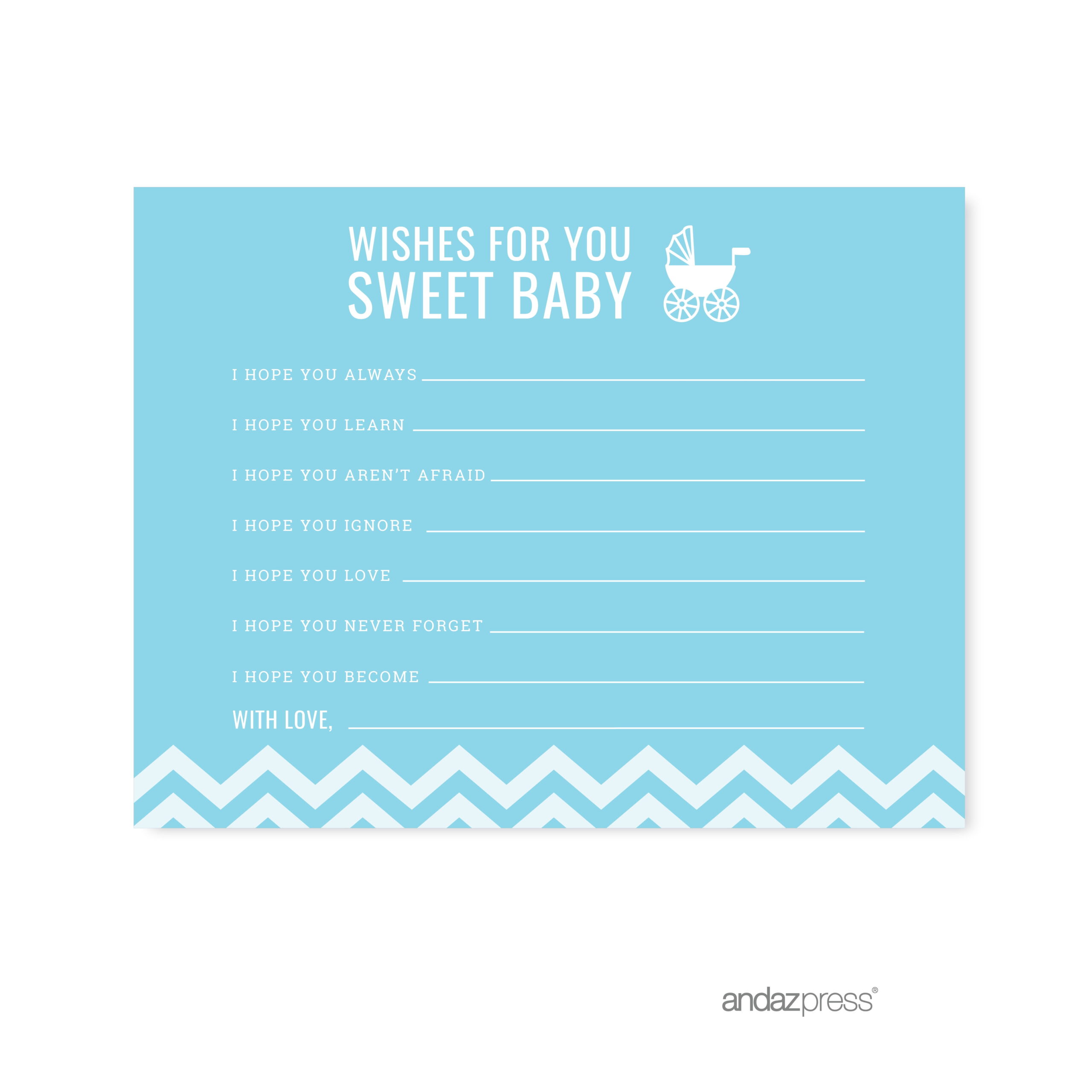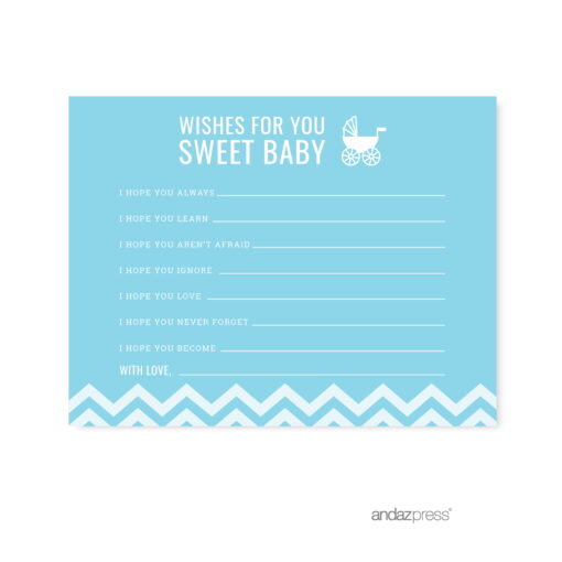 Looking for fun ideas to get everyone to celebrate the arrival of your little one? This fresh and fun baby shower game idea is perfect for both small and large groups of men and women. This is not your run-of-the-mill baby shower game that will induce cringe-worthy reactions and silent internal screams from your guests. It may be cheesy and ridiculous, but this out-of-the-box baby shower game will keep your guests laughing and talking for hours. This is one unique baby shower game that is actually fun (really!) for the mommy-to-be and her special guests. Professionally printed on heavy cardstock, these baby shower game and activity pieces can also serve as a unique framed scrapbook memory of your special day. Don’t forget to get a baby shower prize for the winner – and no, it can’t be a poopy diaper. Made in the USA.Wishes For Baby Baby Blue Chevron Baby Shower Games, 20-Pack
