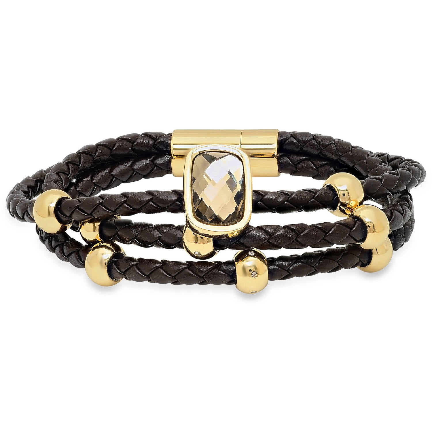 Accessorize with this braided black faux leather bracelet with gold-tone stainless steel beads and a topaz hued centerpiece stone. This 7.75-inch ladies fashion jewelry is secured with a trusty magnetic clasp for a stacked bracelet that stays with you after a night of dancing.
