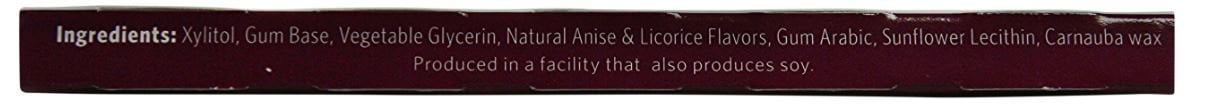 Naturally Better?Sweetened with Birch XylitolNo Sugar or Artificial SweetenersGMO Free!12 Pieces – Soft Chewing GumWe sweeten Xylichew with Birch Xylitol extracted from sustainable US forests. Xylitol helps slow the rate and amount of acid production in the mouth reducing the acid-producing bacteria that erode tooth enamel. Imagine that, a natural sweetener that tastes great and does not promote tooth decay.NO Corn Vegan NO Soy NO Titanium Dioxide Birch Xylitol No sugar or artificial sweetenersGluten Free May reduce the risk of tooth decay GMO Free Free Of Corn, animal ingredients, soy, titanium dioxide, sugar, artificial sweeteners, gluten and GMO.Disclaimer These statements have not been evaluated by the FDA. These products are not intended to diagnose, treat, cure, or prevent any disease.XyliChew Sugar Free Chewing Gum Black Licorice 12 Pieces – Vegan