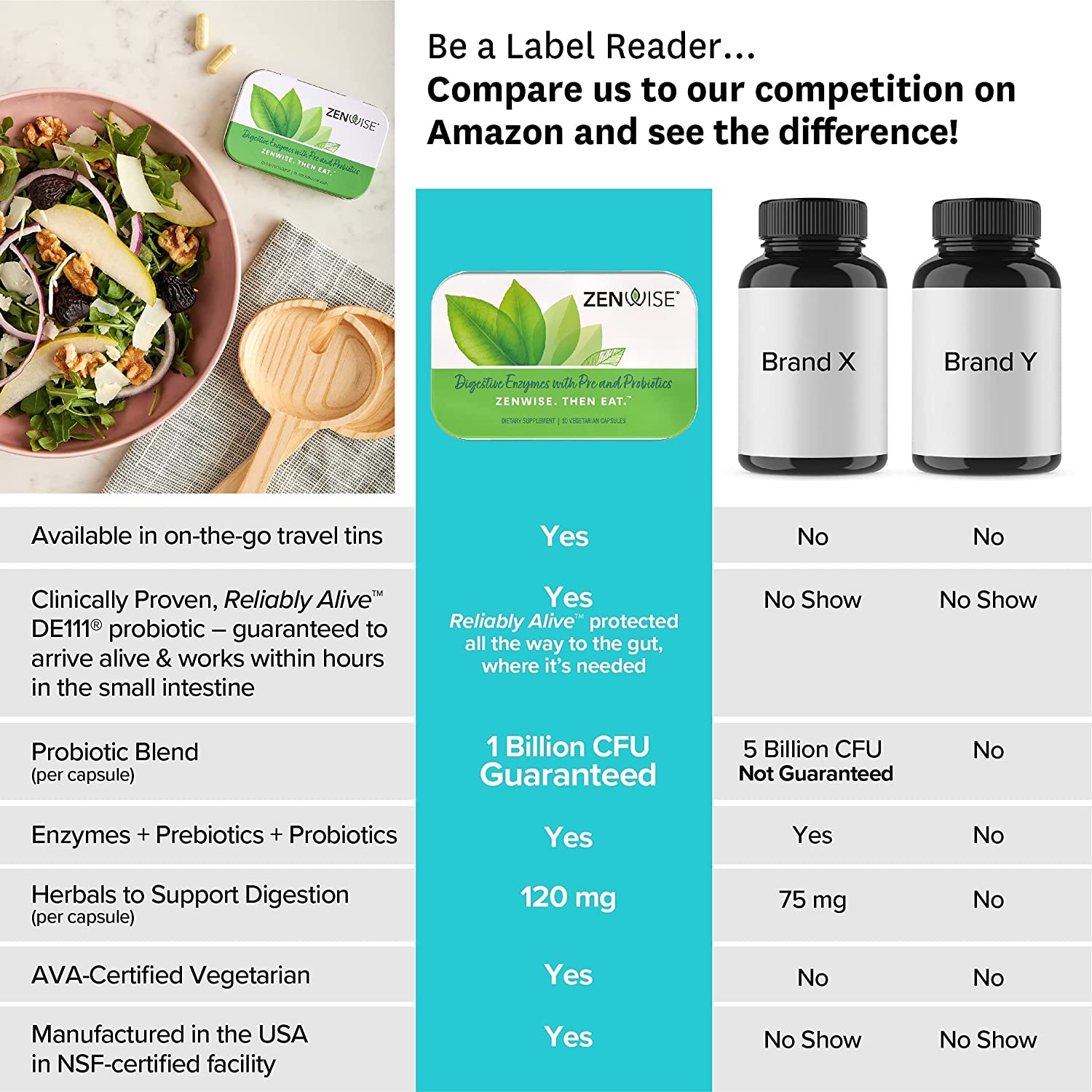 Zenwise Digestive Enzymes, Plus Prebiotics & Probiotics Supplement, Travel Size, for Occasional Gas, Gut Bloating & Irregularity for gut health on the go. Perfect for purse or pocket, Zenwise Digestive Enzymes + Travel tins contain enzymes, prebiotics, and probiotics to promote normal digestion for men and women. This non-GMO, AVA-Certified Vegetarian formula replenishes digestive enzymes that may decline with age and tackles hard-to-digest foods. Includes 1 billion CFUs probiotic blend featuring shelf-stable, Clinically Proven Reliably Alive™DE111®Probiotic, guaranteed to arrive alive and work within hours in small intestine where 90% of nutrient absorption occurs + 70% of immune system resides.
