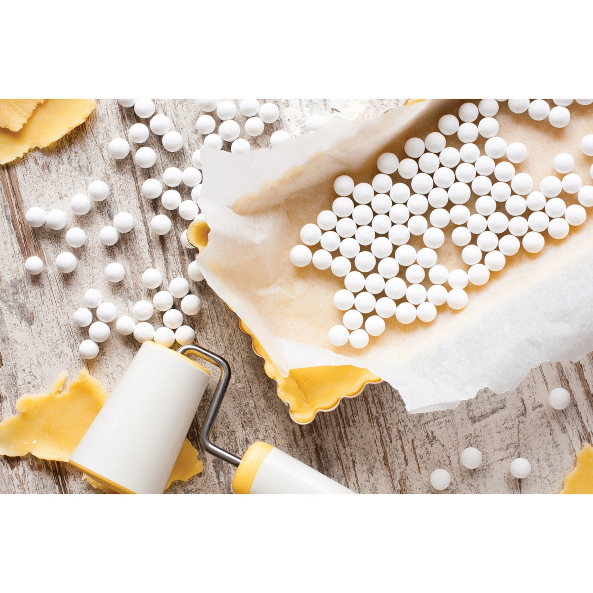 - Individual beads are easy to place and arrange as needed; effectively weighs down pie dough, keeps bubbles from forming, and transfers heat evenly