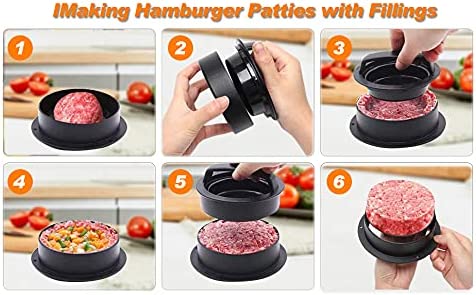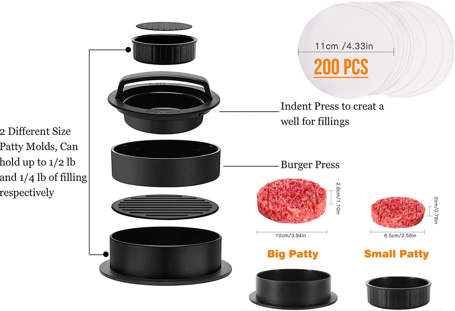 NOGIS 3 in 1 Burger Press Burger Patty Maker Nonstick Burger Press with 200 PCS Patty Paper Very Suitable for Making Stuffed Burgers Traditional Patties