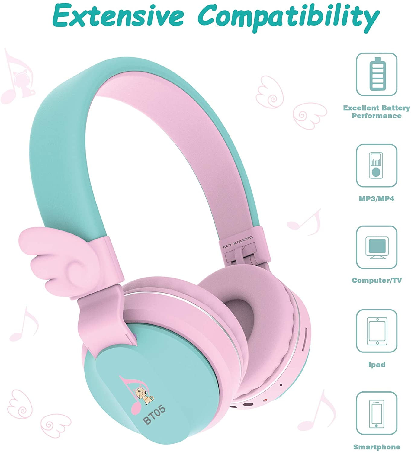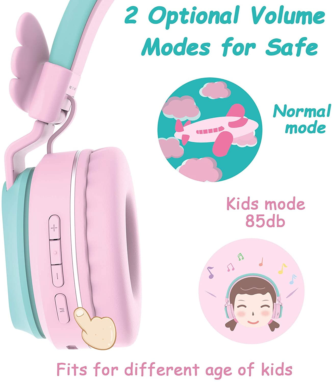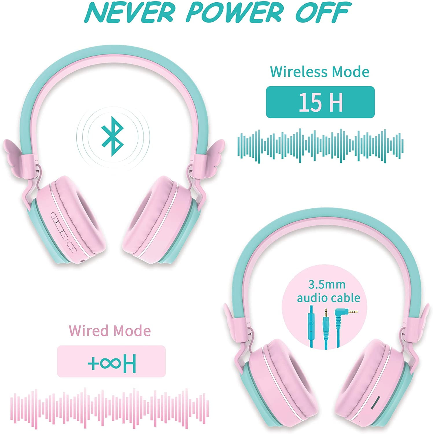 Riwbox BT05 Bluetooth Kids Headphones Wireless Foldable Over Ear with Volume Limited/Mic/TF Card for iPad/iPhone/Tablet(Pink&Green)
