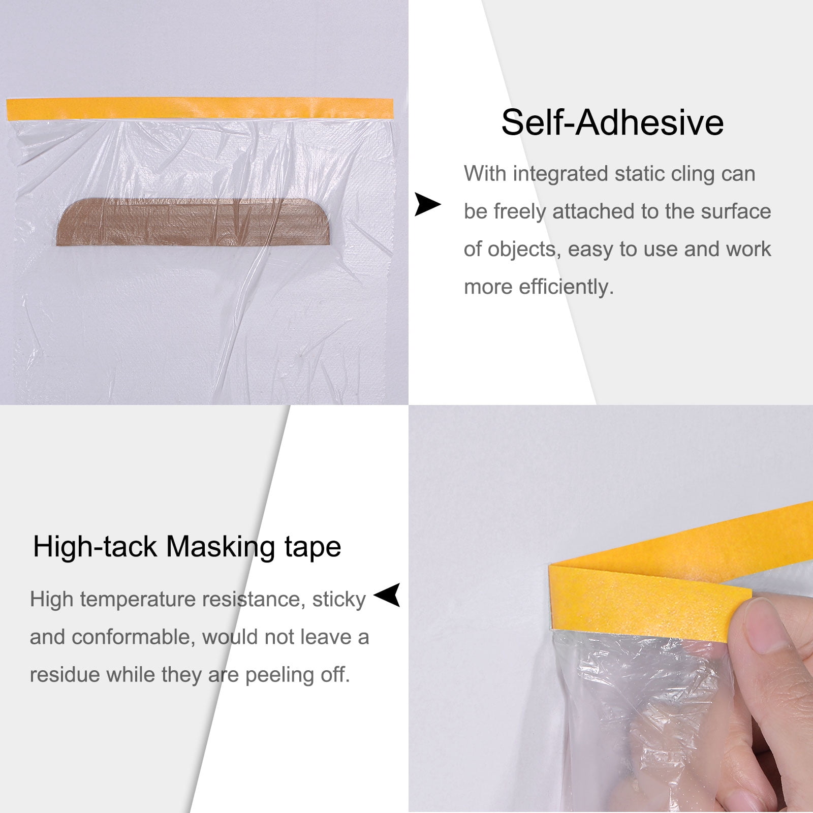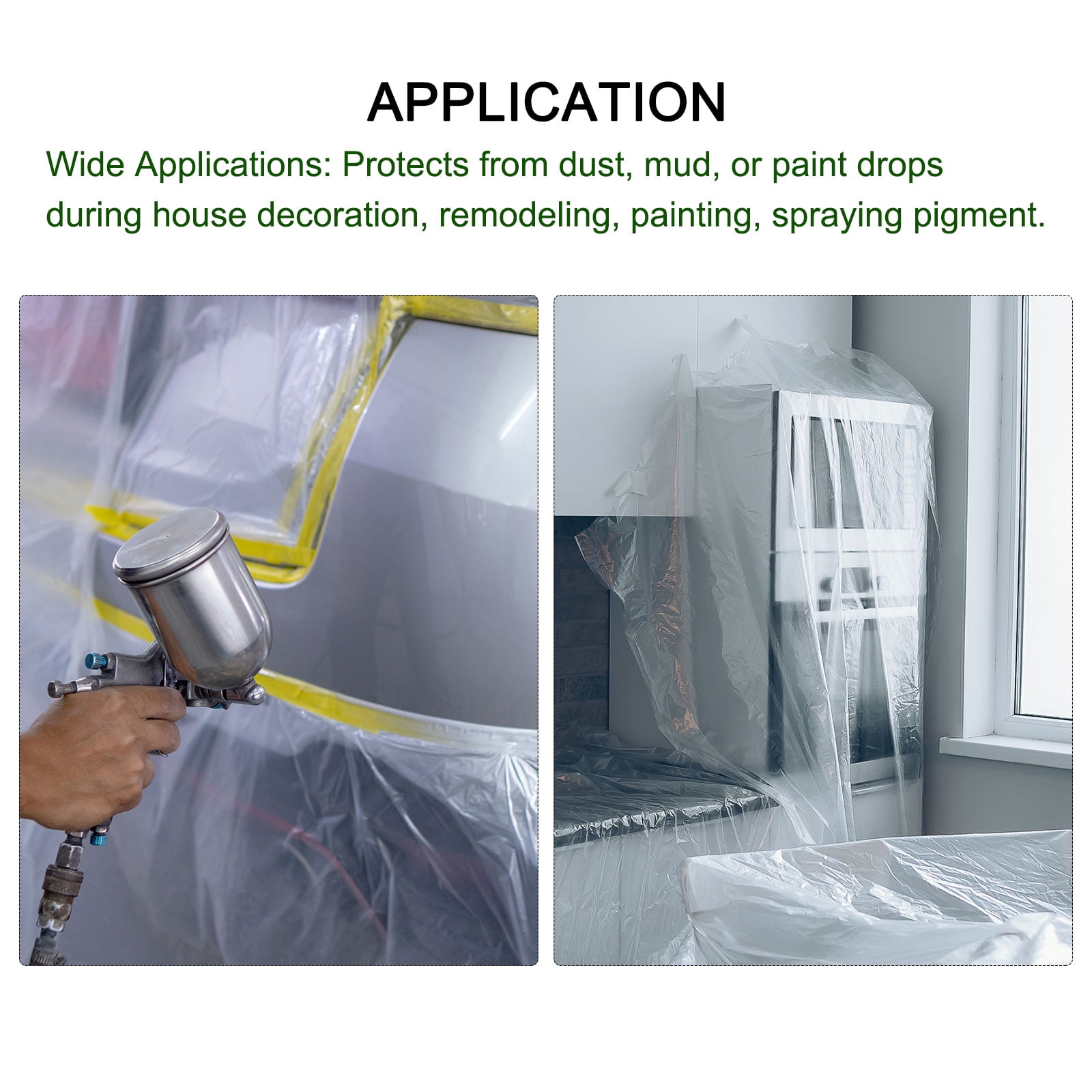 - Lightweight and Cling by static. When plastic sheeting is covered, it can be freely attached to the surface of objects such as furniture and walls to ensure complete protection.