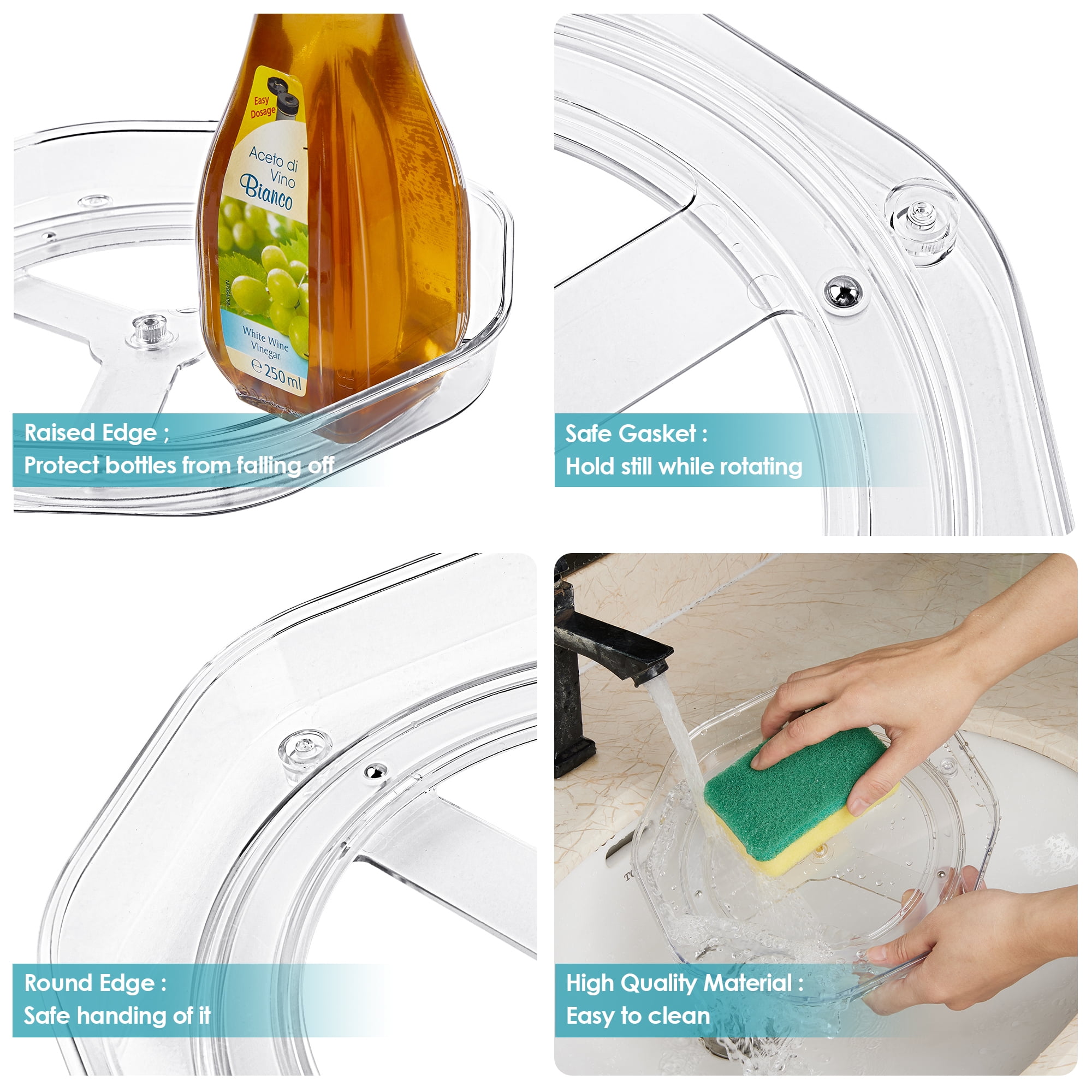 - [360° Turntable & Easy to Pick Up] –Clear kitchen cabinet organizers are equipped with stainless steel ball bearings in the bottom, which can smoothly rotate 360° with no bumps or stops. These turntable organizers help you to easy access to things that kept falling out of sight or reach.