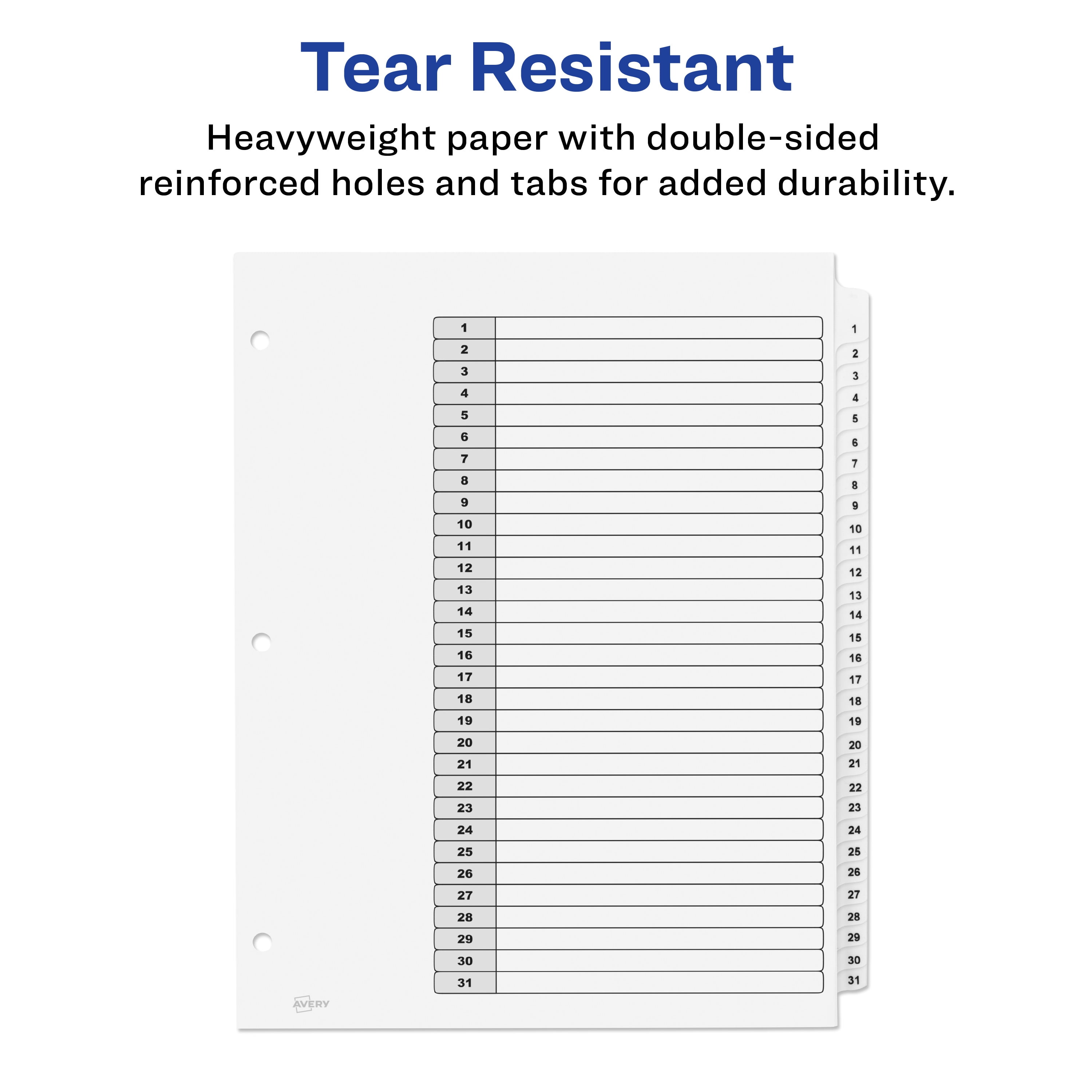 Organize your projects in moments with Avery Ready Index binder dividers. Each white tab is preprinted for a professional appearance. Print your own custom section titles and images onto the table of contents sheet without worrying about labels or inserts. Whether you’re creating planners for classes or hosting a presentation, these dividers are ideal for getting everything sorted. 1 set of 31 dividers are included with each sheet measuring 8-1/2"x11". The 3 binder holes are reinforced on both sides of the heavyweight sheet to prevent creasing and tearing. Each divider tab includes additional reinforcement along the edge of each page to distribute stress and resist folding. The printable table of contents is dual compatible with both laser and inkjet printers. This sheet can also be printed in either portrait or landscape so that your projects can be displayed in any orientation. Just flip the sheet to view the other layout on the opposite side. Try out free templates for these dividers and check out the Avery Design & Print software at avery.com/templates.