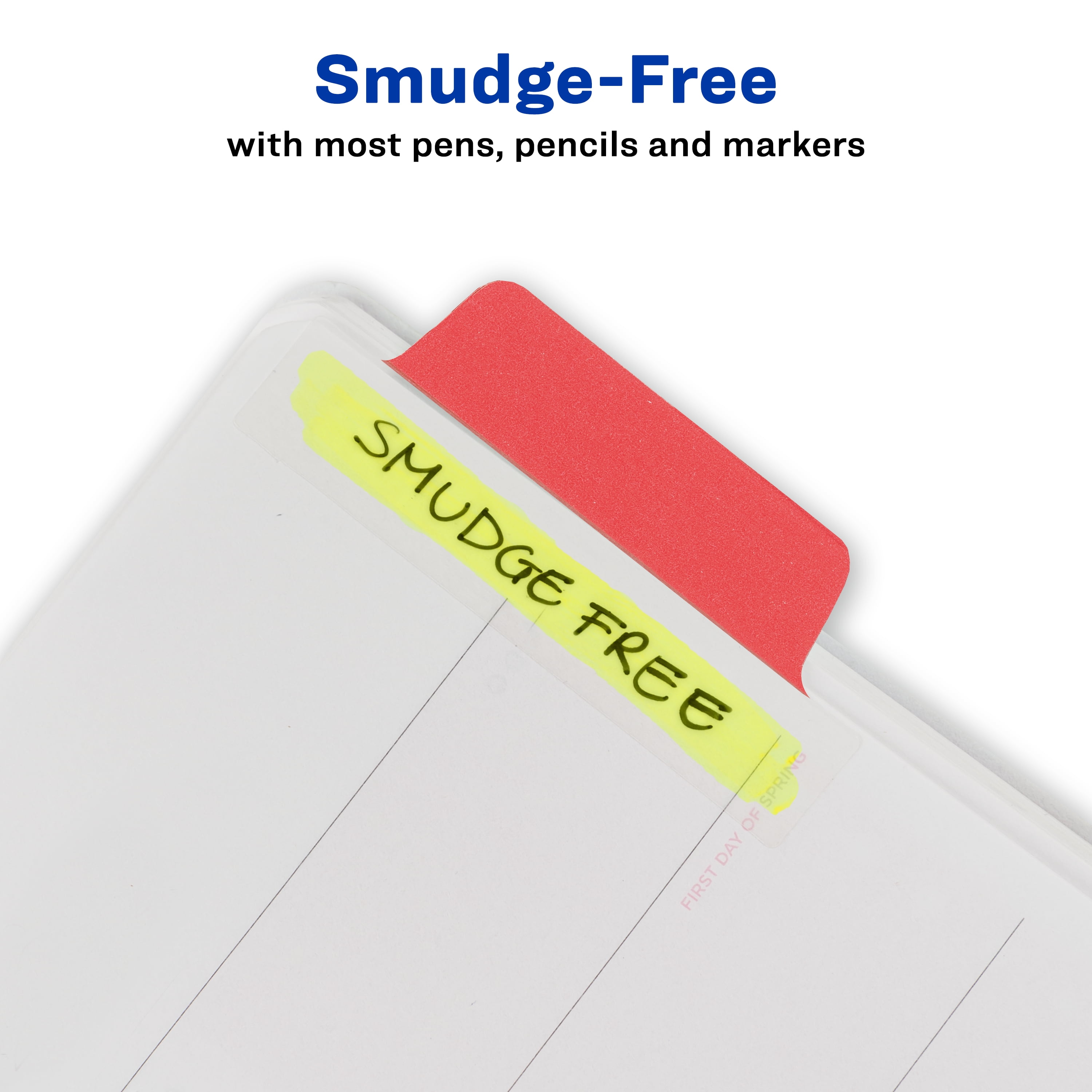 Give your planner and school supplies an upgrade with the Avery Ultra Tabs in assorted primary colors. Every repositionable margin sticky tab is 2.5" x 1". The tab can be written on with permanent markers and the clear tab body can be written on with most permanent markers, pens, pencils and highlighters. The transparent tab body features a smudge-free surface for writing (drying time can vary depending on the ink used). These bright color tabs make organizing fun for your planners, notebooks, recipe books, and more!