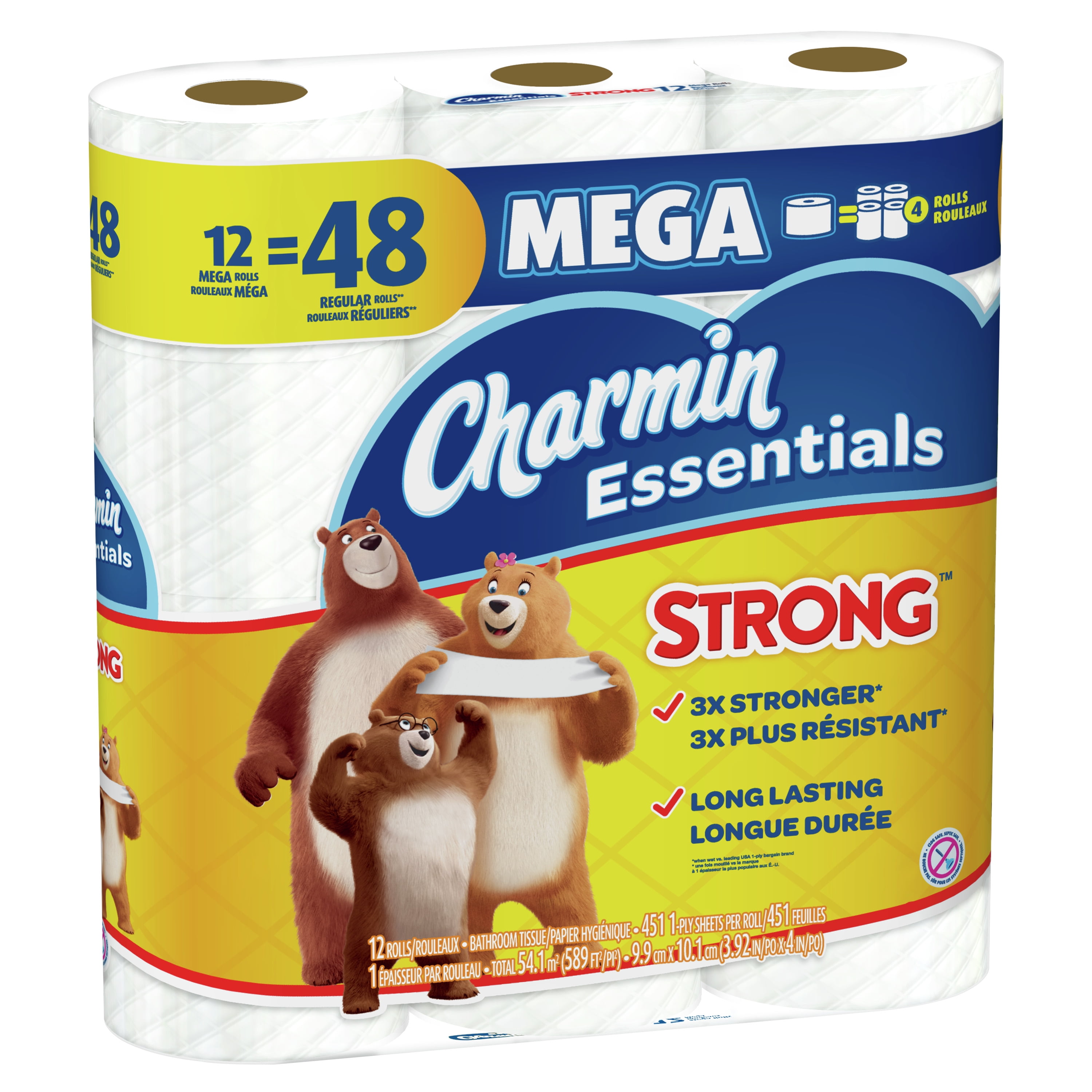 - Pack contains 12 Mega Rolls (451 sheets per roll) of Charmin Essentials Strong toilet paper