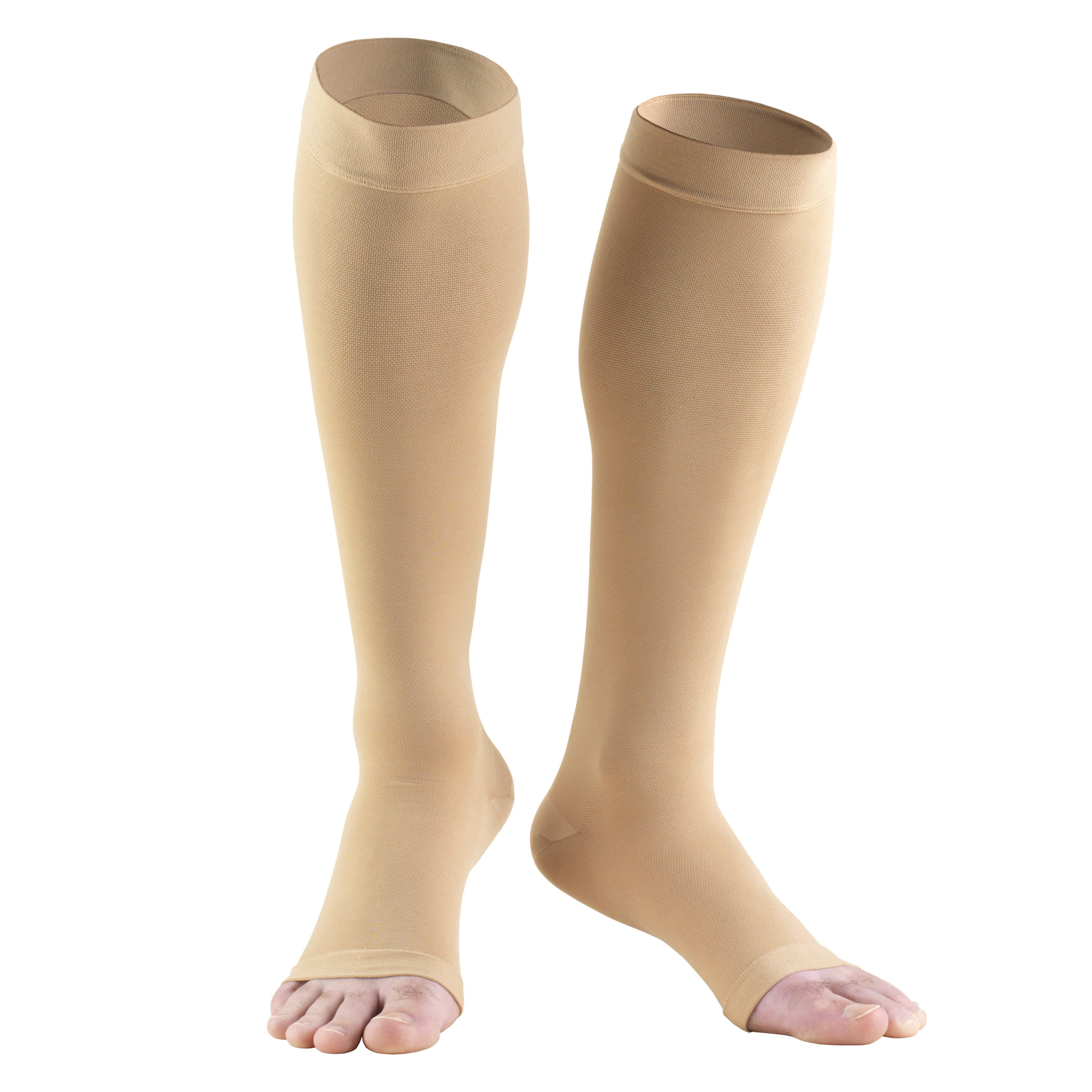 Truform 30865 Medical Compression Stockings: Designed to help relieve moderate conditions associated with poor circulation and venous insufficiency. Truform compression socks feature classic styling and a smooth knit texture fabric that conceals unsightly blemishes. Truform medical compression is designed for men and women. Truform compression hose help in the treatment of: tired aching legs, moderate varicose veins, spider veins, DVT, and moderate leg, ankle, foot swelling. Use post surgery to prevent blood clots, or daily wear to ensure healthy legs when sitting or standing for long periods of time. Firm compression 20-30 mmHg of pressure with graduated support to promote circulation, healing, and recovery. Open Toe.