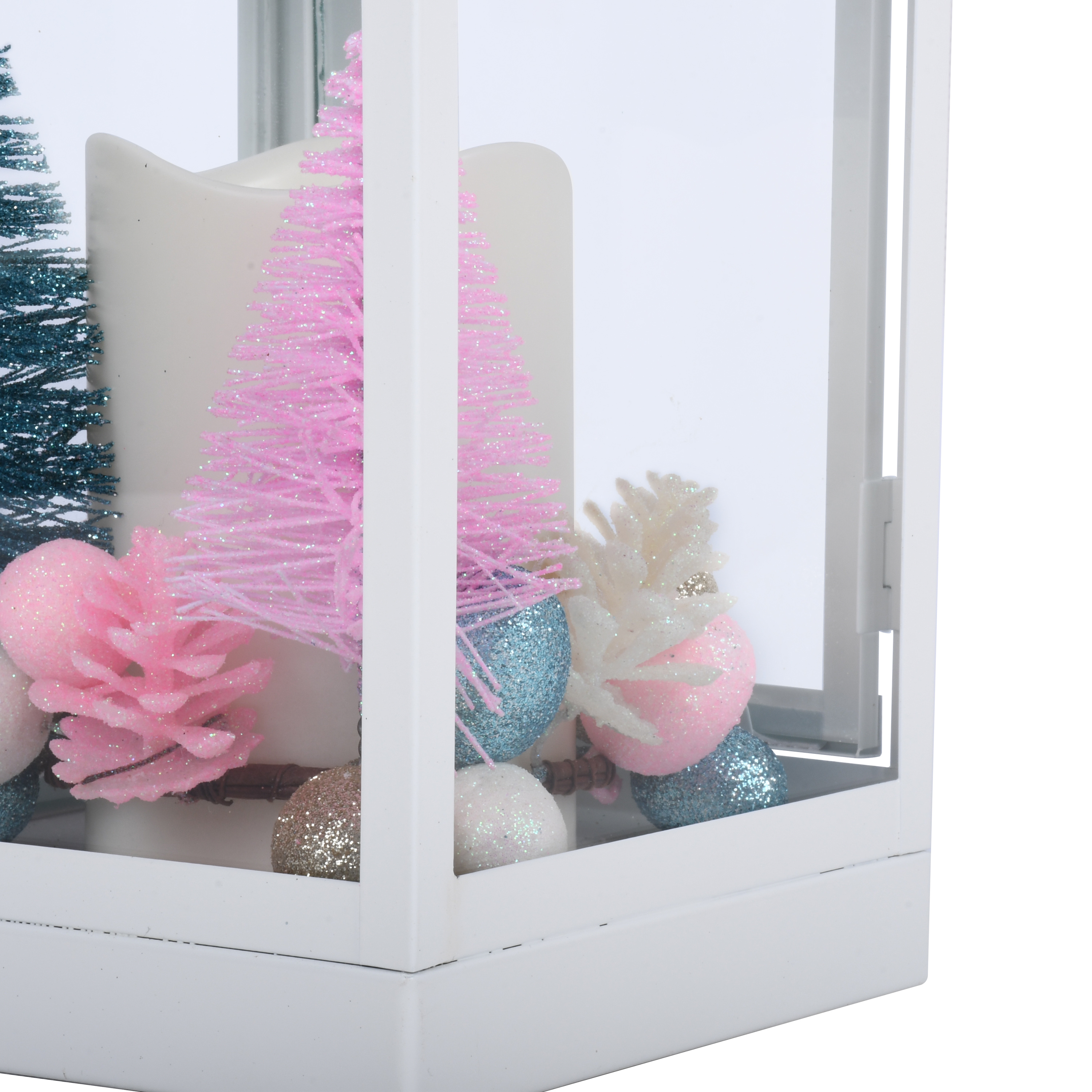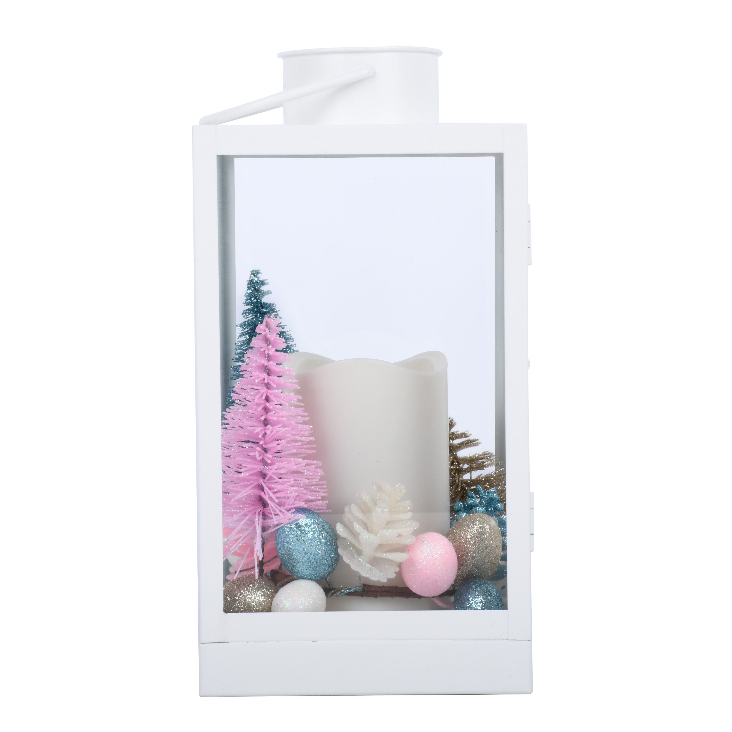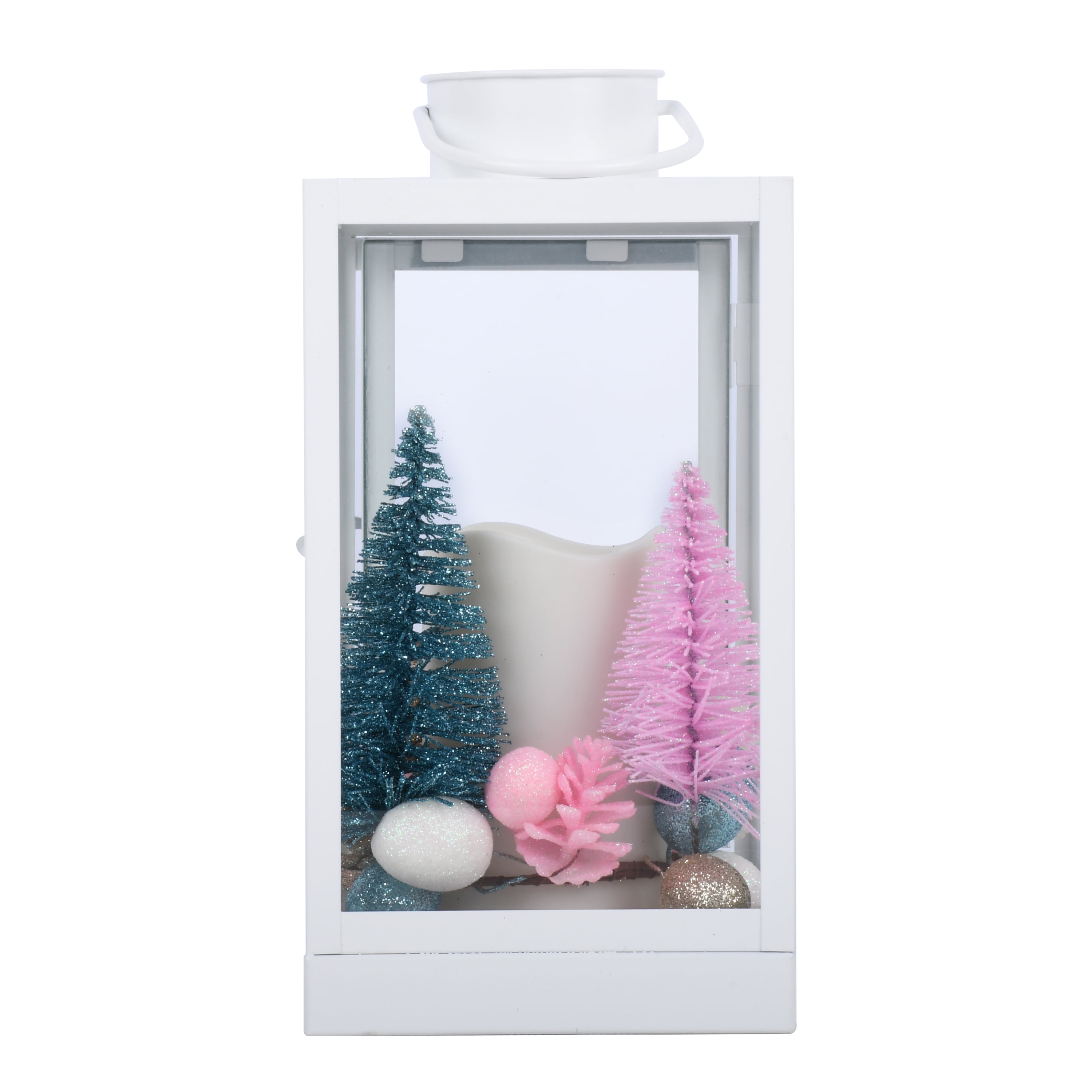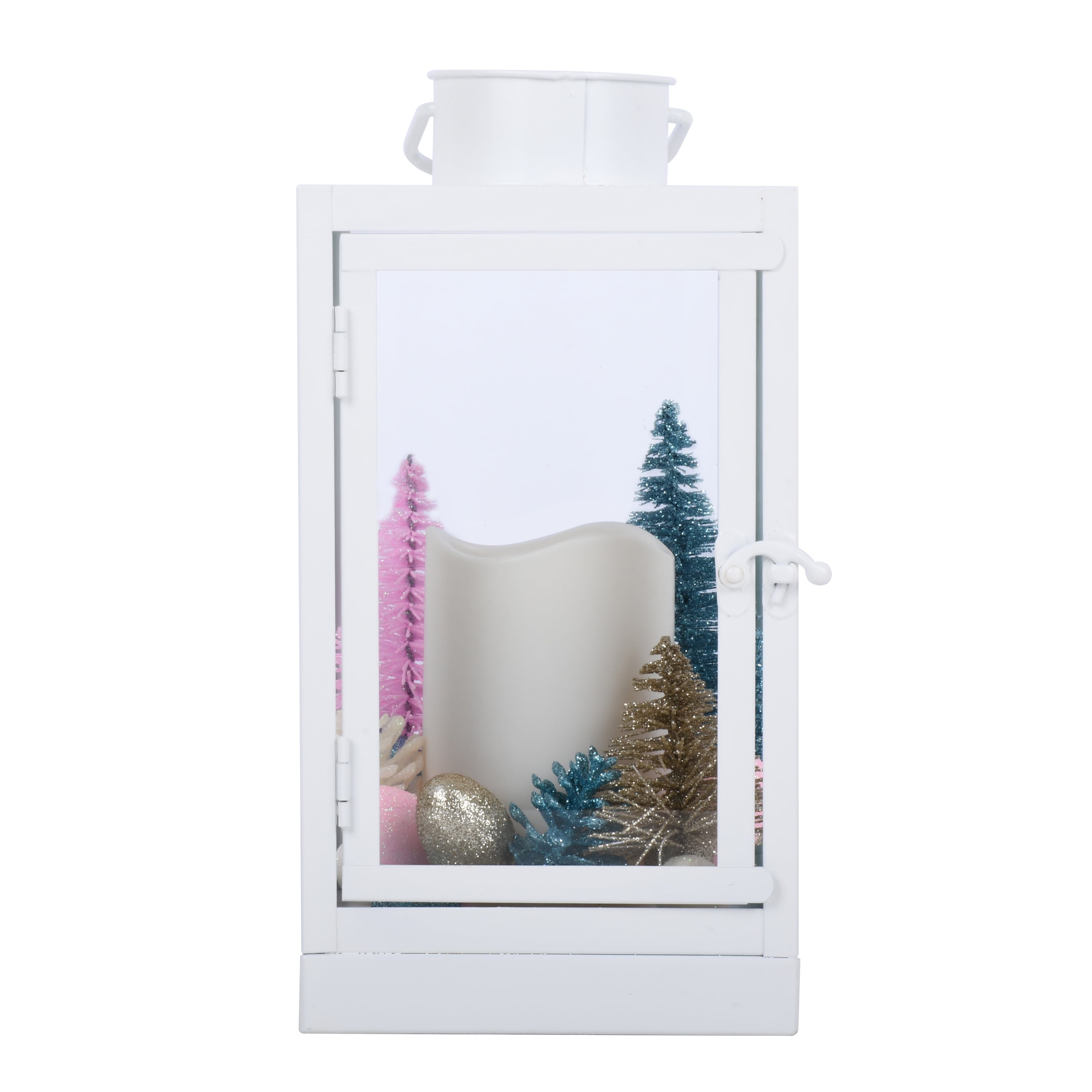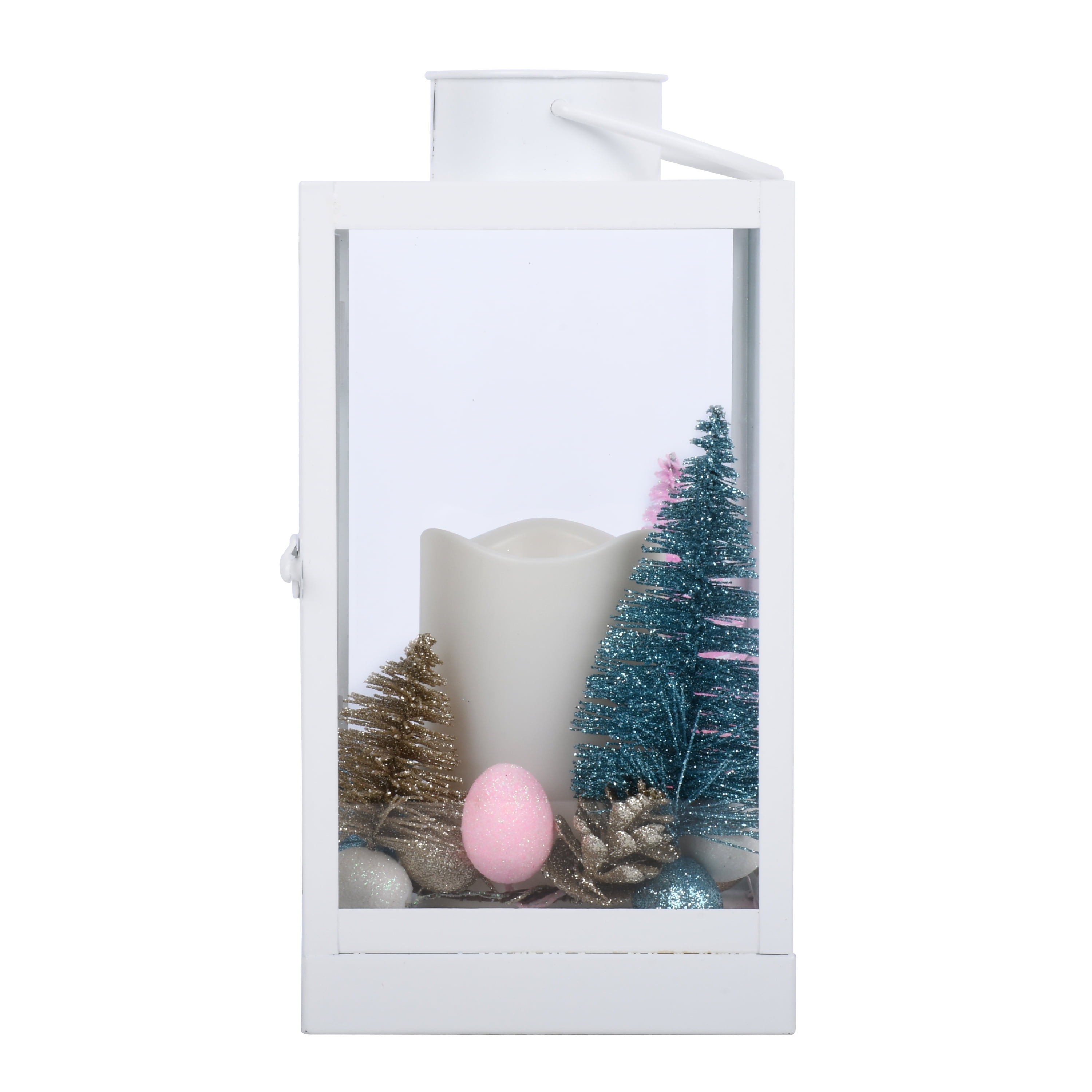 Holiday Time 10.6 Inch Pop of Color White Metal Decorative Lantern with LED Candle features colorful Christmas tree looks and colored eggs ornamental. Enhance the beauty of your home inside with this long-lasting, contemporary, 10.6-inch Metal LED Lantern that can be hung or stand-alone. This elegant Lantern features a battery-operated, plastic Flameless LED Candle that provides a safe, beautiful glow like a real flame. Requires three (3) AAA batteries- not included; Manual on/off switch on base for easy use. In addition, the lantern includes an on/off timer that conveniently turns on at the same time every day for 6 hours and off for 18 hours. Assembled product dimensions: 5.5-inch Lx5.5 inch Wx10.6 inch H.