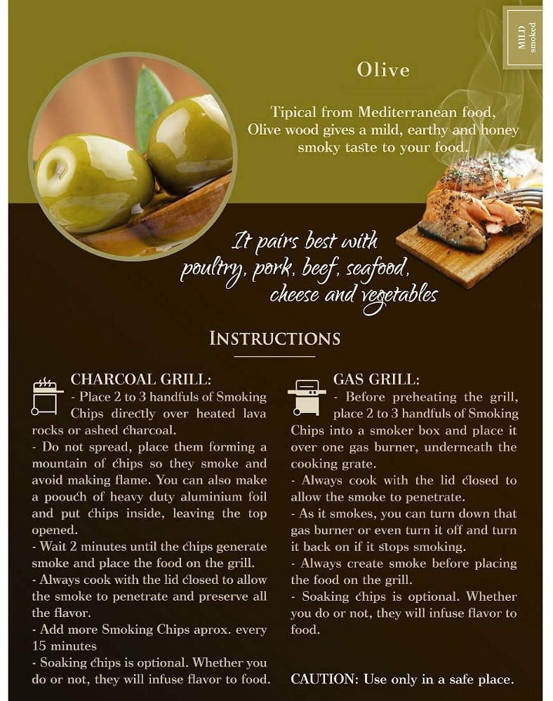 EXCELLENT QUALITY- made from 100% natural wood brought all the way from Argentina with no artificial flavor, additive or fillers. FLAVOR ENHANCING- with a mild intensity and subtle sweet flavor of the apple wood it is perfect to use when cooking pork, lamb, seafood, cheese vegetables and much more. MULTIPLE USES- there is no limits, you can use it in your kamado, smoker, electric, gas or charcoal grill to get the ultimate wood cooking experience and give that unique flavor to all of your favorite dishes. CONVENIENT QUANTITY- with 180 cubic inches you will have the perfect amount to make the best out of your Sunday BBQ. EASY TO USE- ready to place into your grill and start spreading the flavor into your food.HUMOS Olive Smoking Wood Chips for BBQ, Smoker, Kamado and Gas, Charcoal & Electric Grill (Olive)