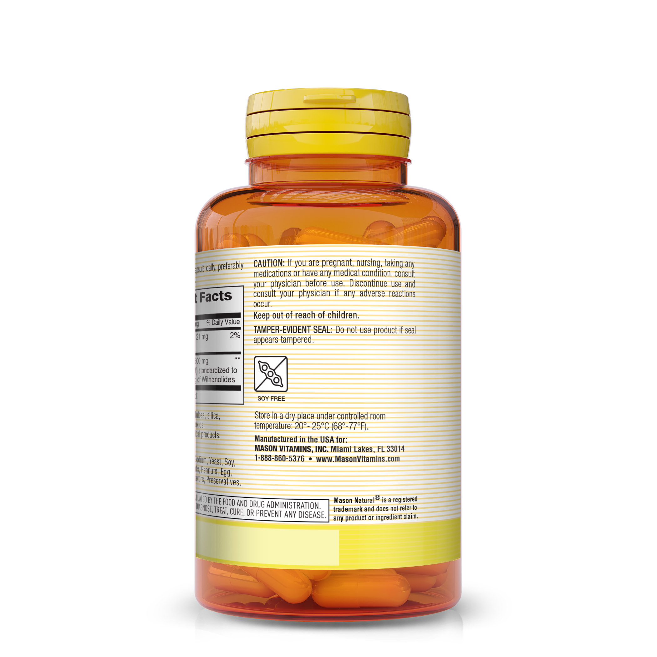 - Ashwagandha 500 mg contains 21 mg of Calcium and 500 mg of Ashwagandha Extract from Withania somnifera root that is standardized to contain not less than 5 mg of Withanolides and may help support physical performance and strength. It is guaranteed no added sugar, sodium, yeast, soy, corn, wheat, dairy, fish, tree nuts, peanuts, egg,