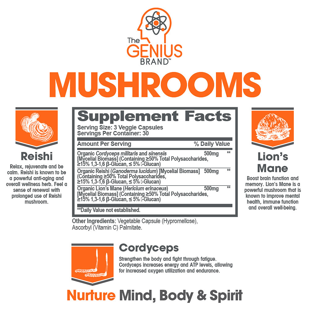 - 3 IN 1 – Enhance mental clarity, immune function, and natural energy in a single formula, Genius Mushrooms combines three of the best mushroom species together into one wellness supplement.