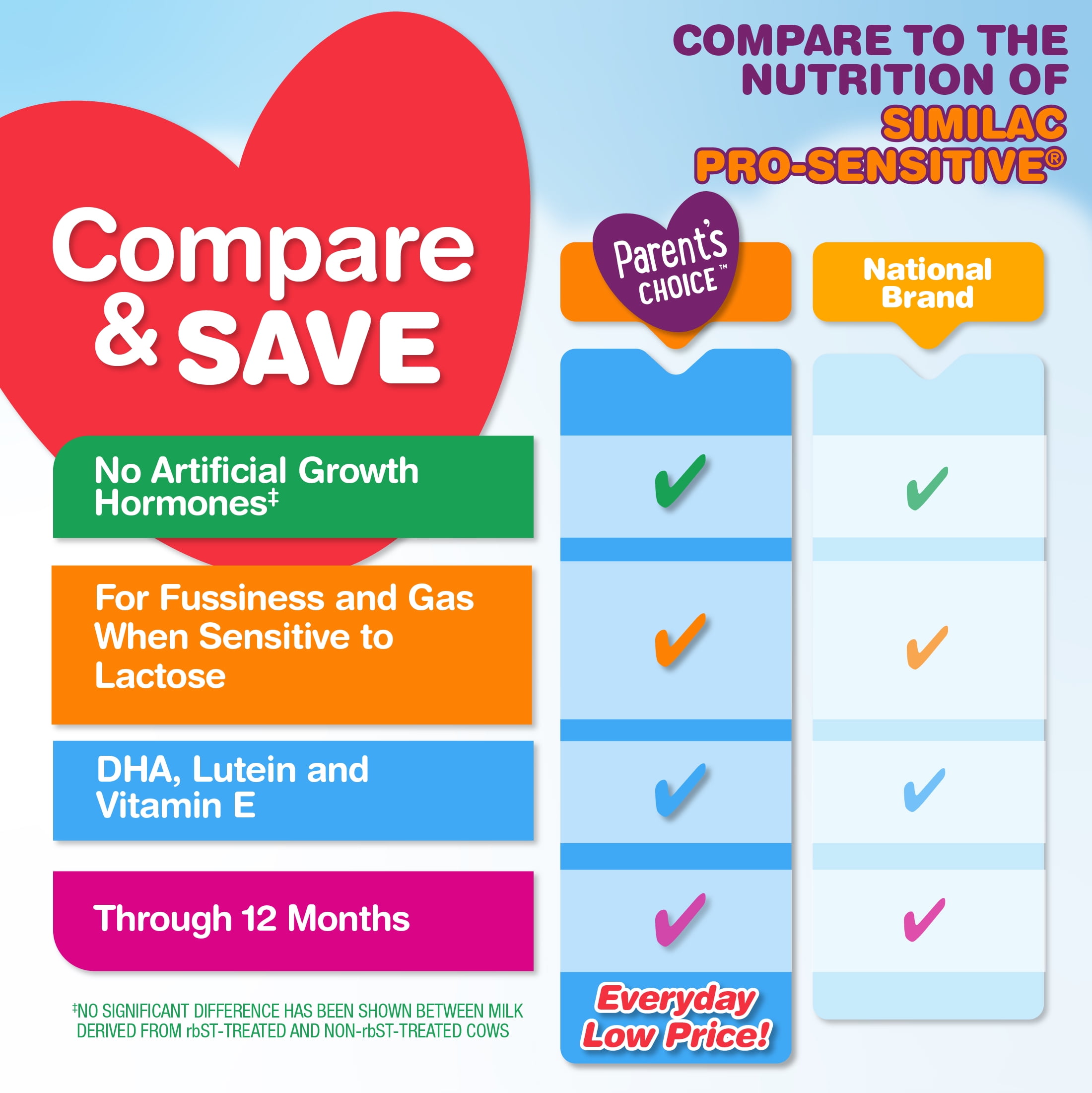 - Less Lactose: Parent’s Choice Sensitivity Baby Formula with Iron has 99 percent less lactose than standard milk-based infant formula; compare to Similac Pro-Sensitive Infant Formula