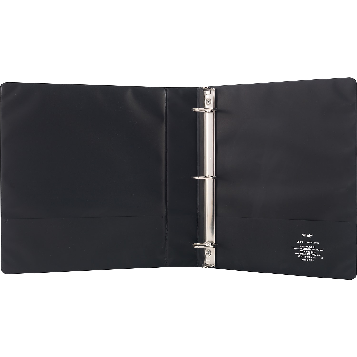 Use the Simply black non-view binder to store up to 275 pages on 1.5-inch round rings, and enjoy interior pockets for even more storage.The Simply light-use non-view binder stores up to 275 sheets on 1.5-inch round rings, making this binder suitable for small to medium projects. Back-mounted rings ensure pages turn smoothly and are easy to access when the binder is open. A handy label holder on the spine of the Simply 1.5-inch round ring binder offers easy labeling for at-a-glance identification of the contents. Capacity of 275 sheets for medium-sized projects. 1.5-inch round rings with easy-open mechanism. The Simply black non-view binder has a label holder on the spine so users can insert a spine card for fast, easy identification and organization. Back-mounted rings so the pages lie flat. Two interior pockets provide extra storage for loose papers and easy accessibility to frequently used documents. The Simply 1.5-inch round ring binder is a green product, comprised of 16 percent post-consumer recycled material.Convenient StorageThe Simply 1.5-inch round ring binder has tabs at the top and bottom of the rings to ensure they open and close smoothly without pinching fingers, making loading and unloading pages hassle-free. Capable of holding up to 275 letter-size pages on the rings, this binder can also store loose papers in the two pockets on the interior of the front and back panels. Back-mounted rings allow the Simply black non-view binder to lie flat when opened, enabling pages to turn smoothly and providing easy access for loading and unloading. Professional AppearancePlain and simple, the Simply 1.5-inch round ring binder has a clean, professional look. A label holder provides space for a spine card for easy reference and identification of the contents stored inside. Sold as 1 Each.
