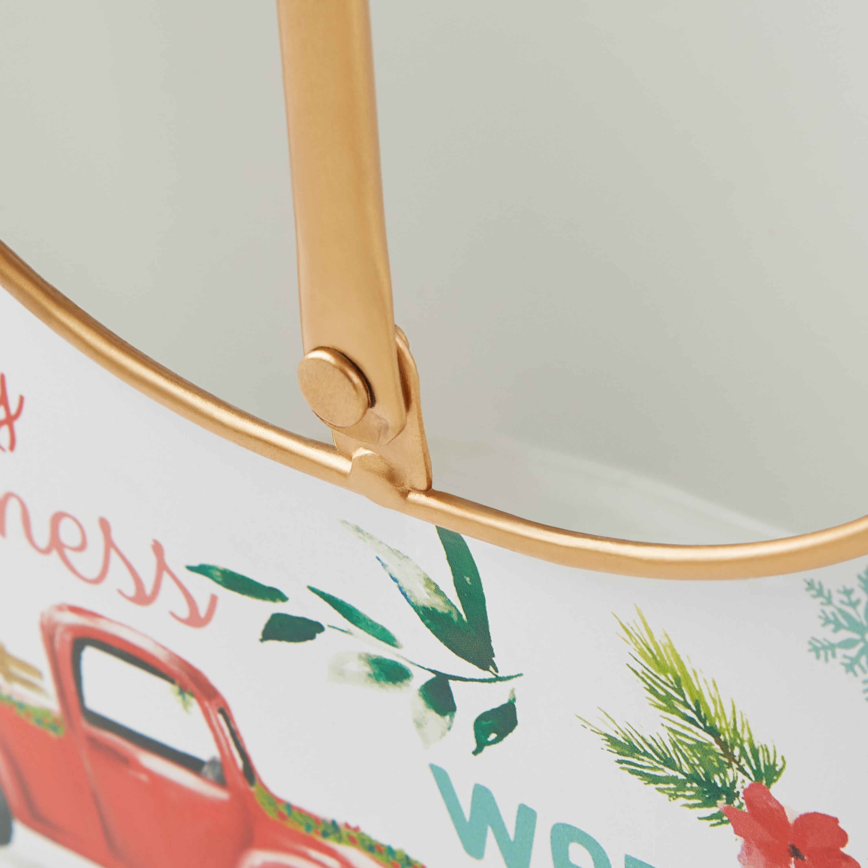 Add a touch of country charm to your holiday decorations with The Pioneer Woman 2-Piece Holiday Metal Baskets Set. Getting your home into the holiday spirit is simple when you have these two metal baskets on display. The larger white metal basket features a festive vintage truck print with seasonal flowers that’s perfect for holding fresh linens or cozy throws, and the smaller basket features a festive green background with a floral print with seasonal flowers that’s perfect for storing reading materials or crafting supplies. Both baskets have a swivel handle for easy placement just about anywhere. Celebrate the season in style with The Pioneer Woman 2-Piece Holiday Metal Baskets Set.