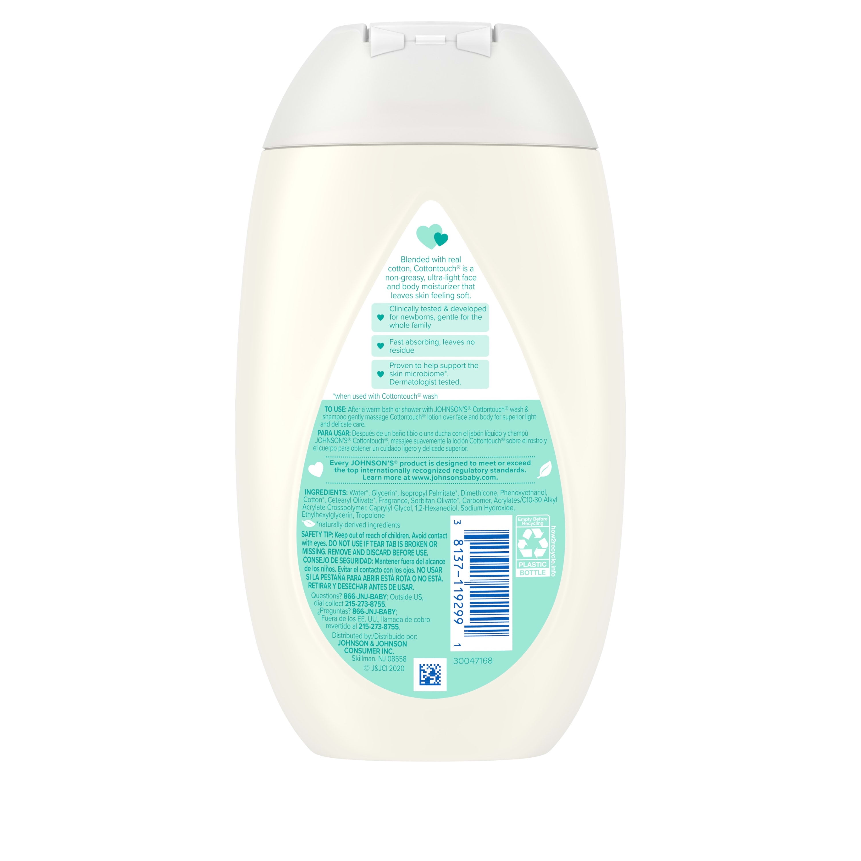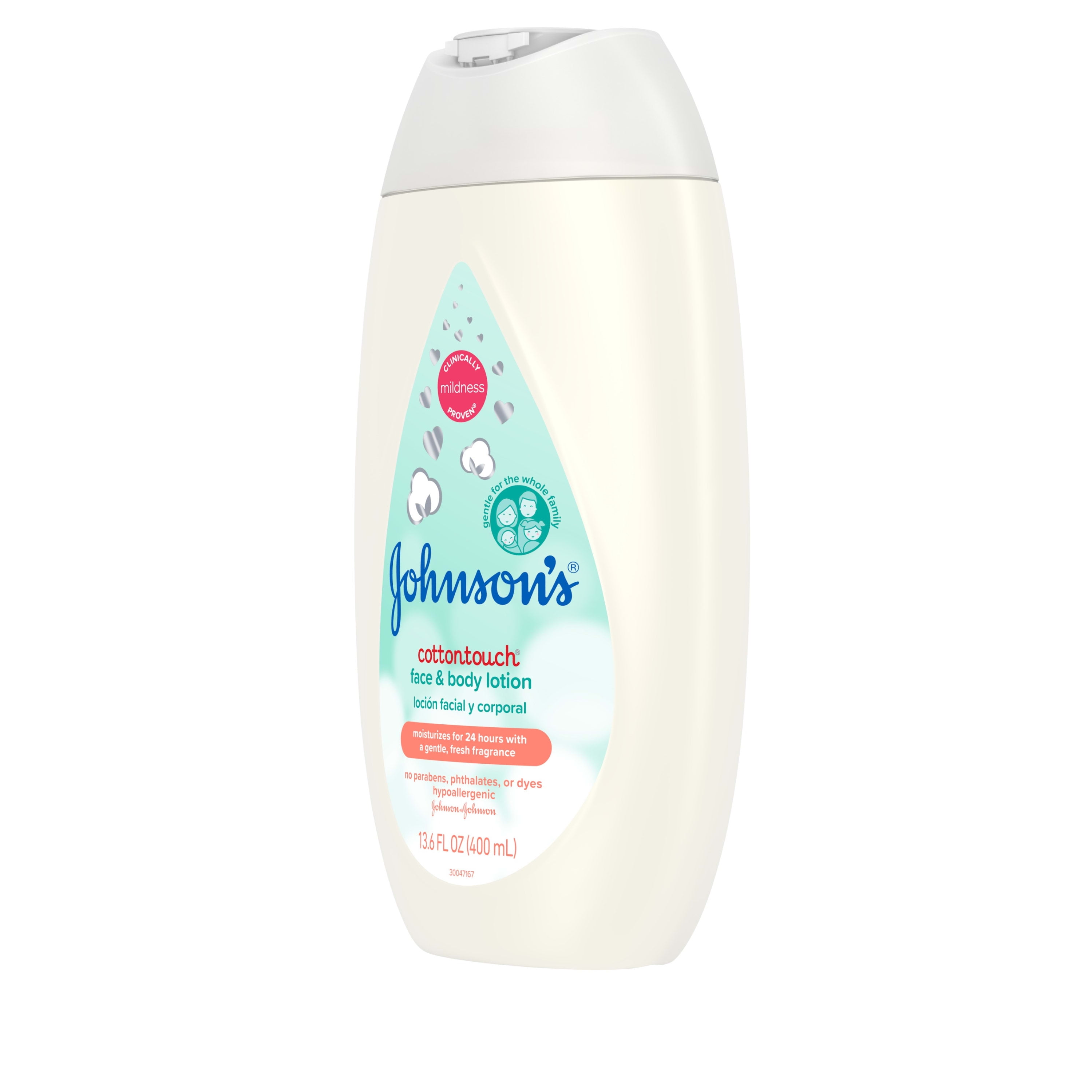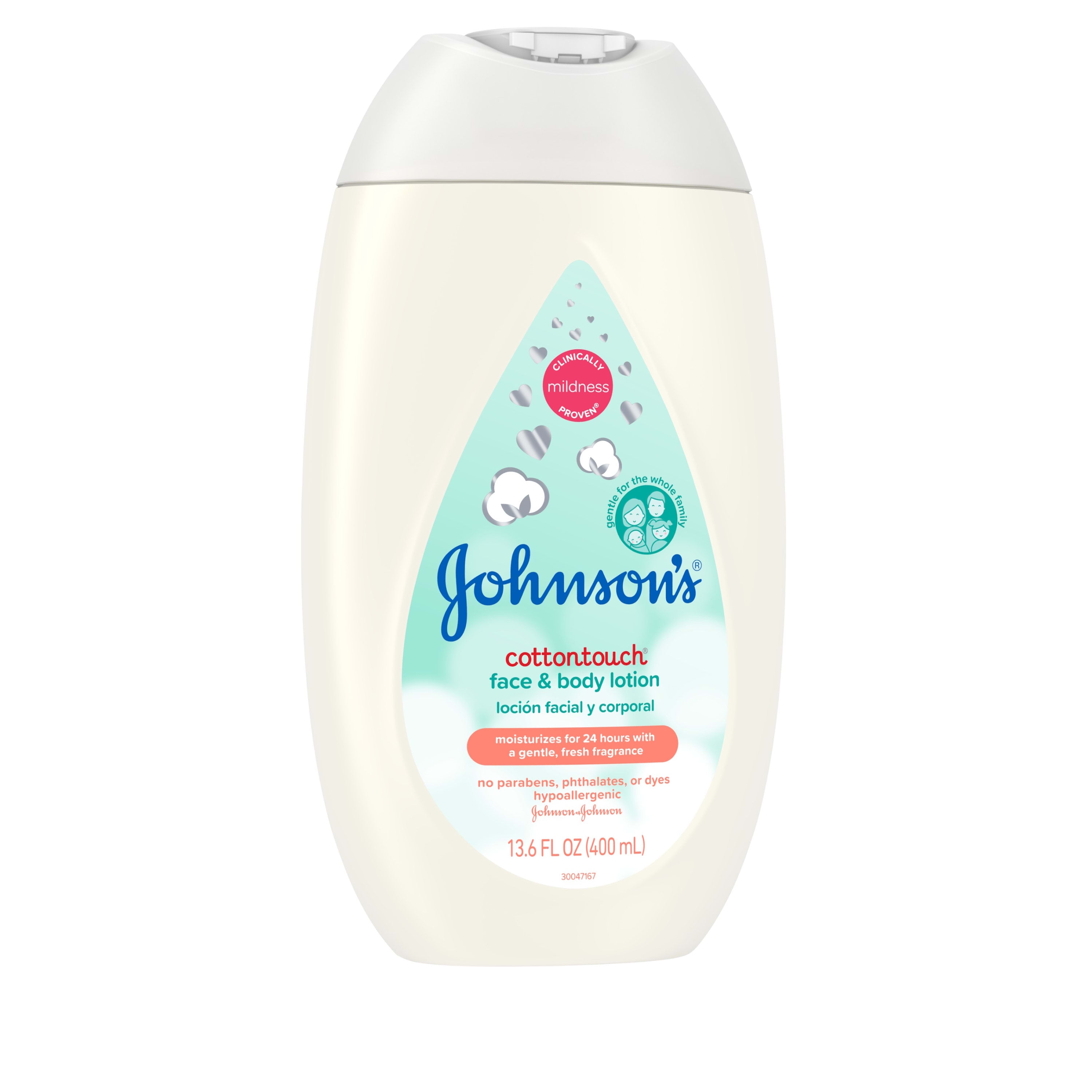 Moisturize and protect delicate skin from dryness with Johnson’s CottonTouch Baby Face and Body Lotion. This ultralight, breathable baby lotion leaves skin feeling soft and moisturizes for a full 24 hours. From Johnson’s, the #1 choice of hospitals, the silky soft lotion is clinically tested and developed for newborn baby’s sensitive skin and gentle enough for the whole family. The non-greasy, fast-absorbing formula is dermatologist-tested and proven to help support the skin’s microbiome when used with CottonTouch Wash. The hypoallergenic baby lotion leaves behind no residue, has a fresh fragrance, and is paraben-, phthalate-, and dye-free. After a warm bath or shower with Johnson’s CottonTouch 2-in-1 Newborn Wash & Shampoo, massage the daily lotion over face and body to leave skin touchably soft. Our safety assurance process is designed to meet or exceed the top internationally recognized regulatory standards.