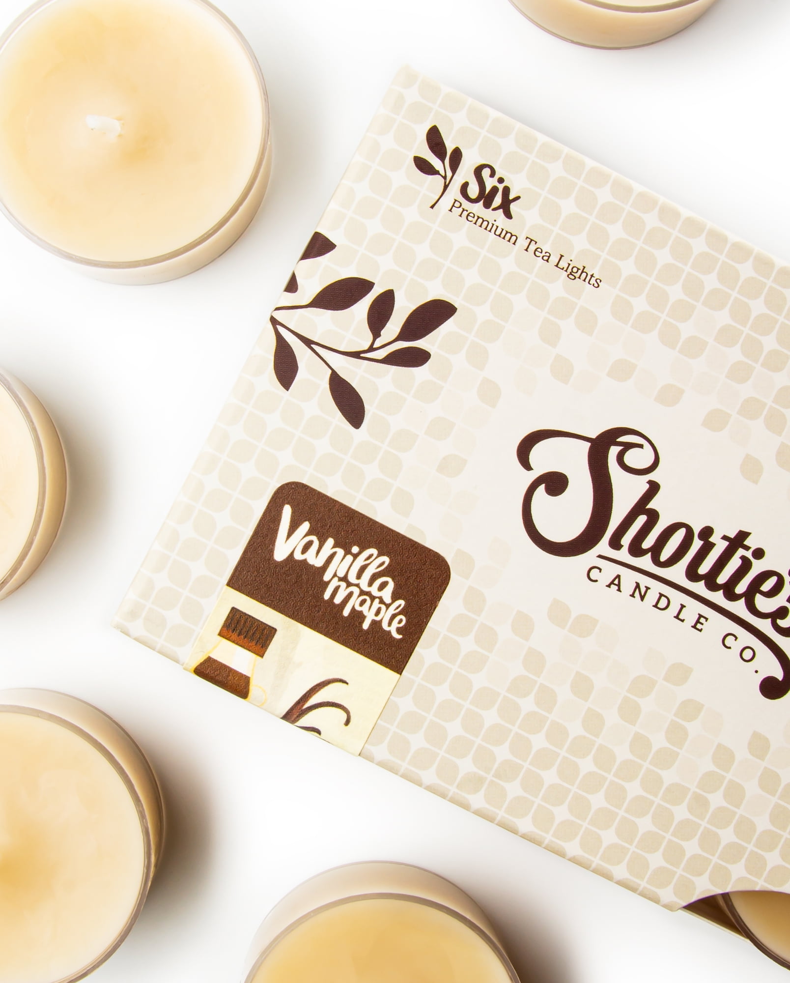 - Our Vanilla Maple Tea lights are hand poured with our classic food grade natural paraffin wax blend for great scent throw.