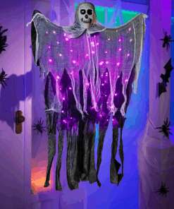 Halloween Hanging Grim Reaper with 60 LED Purple Halloween Lights,2 Lighting Modes Halloween Decoration Waterproof Battery Operated for Indoor/Outdoor Party,Yard,House Decor