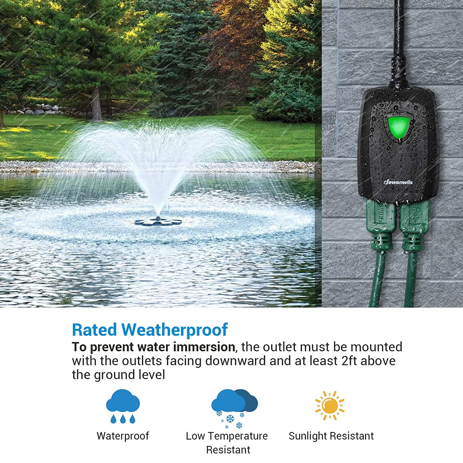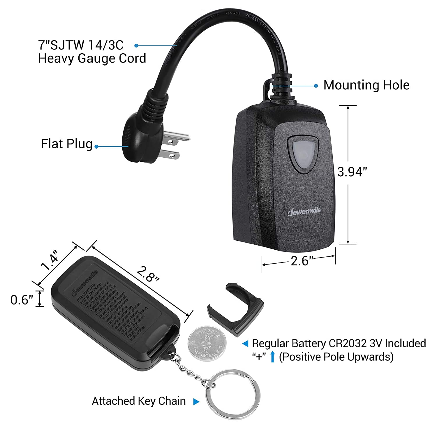 Outdoor Remote Control Outlet with 2 Remotes,Up to 15A / 1875W Resistive, 1000W Tungsten, 1/2HP; 2 grounded AC outlets available 7-inch SJTW 14/3C heavy gauge thick extension cord; 3 prong flat plug Allow using multiple outlet sets simultaneously in your house without interference; no self-interference or interference with other existing RF remote systems; no worrying about affecting your neighbors’ lights; Programmable and Expandable Quick to install with tool-free set-up; no programming required; CR2032 3V battery included; ETL and FCC certified