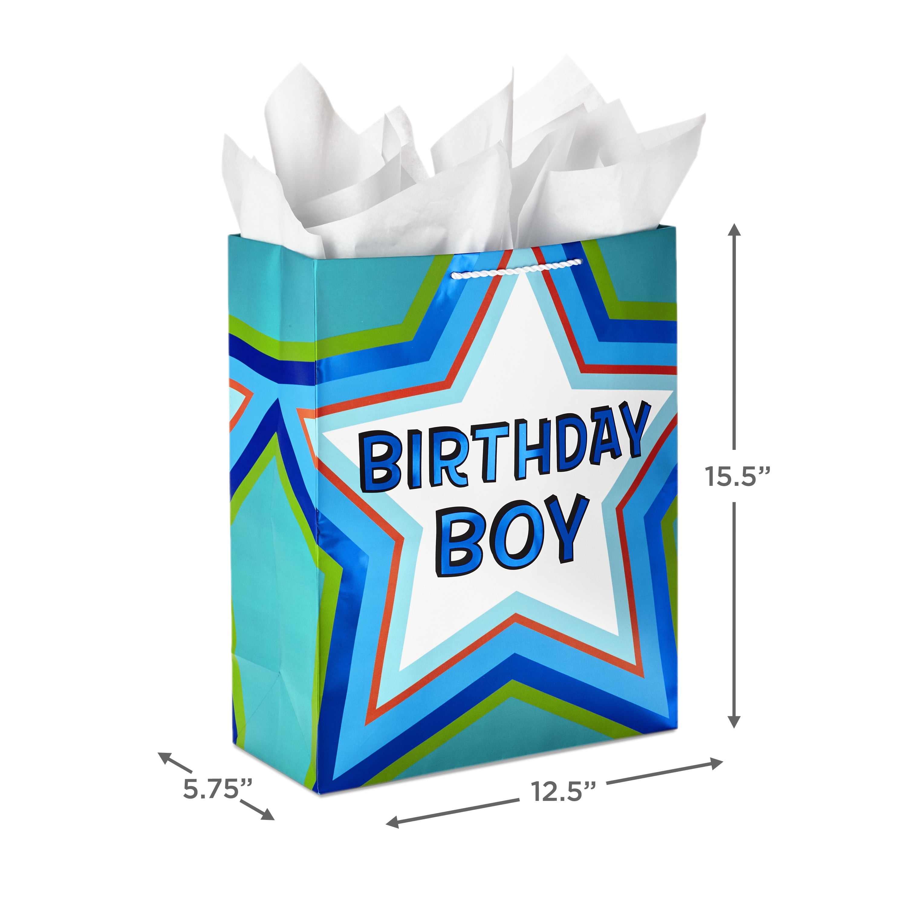 Make your son, nephew or grandson smile with this festive birthday gift bag made just for him. With a bright star design, bold lettering and blue foil accents, this extra large gift bag is great for holding books, clothing, electronics, toys or a collection of smaller items. All-in-one gift wrap solution includes 4 sheets of white tissue paper to make wrapping birthday presents quick and easy. The Hallmark brand is widely recognized as the very best for greeting cards, gift wrap, and more. For more than 100 years, Hallmark has been helping its customers make everyday moments more beautiful and celebrations more joyful.