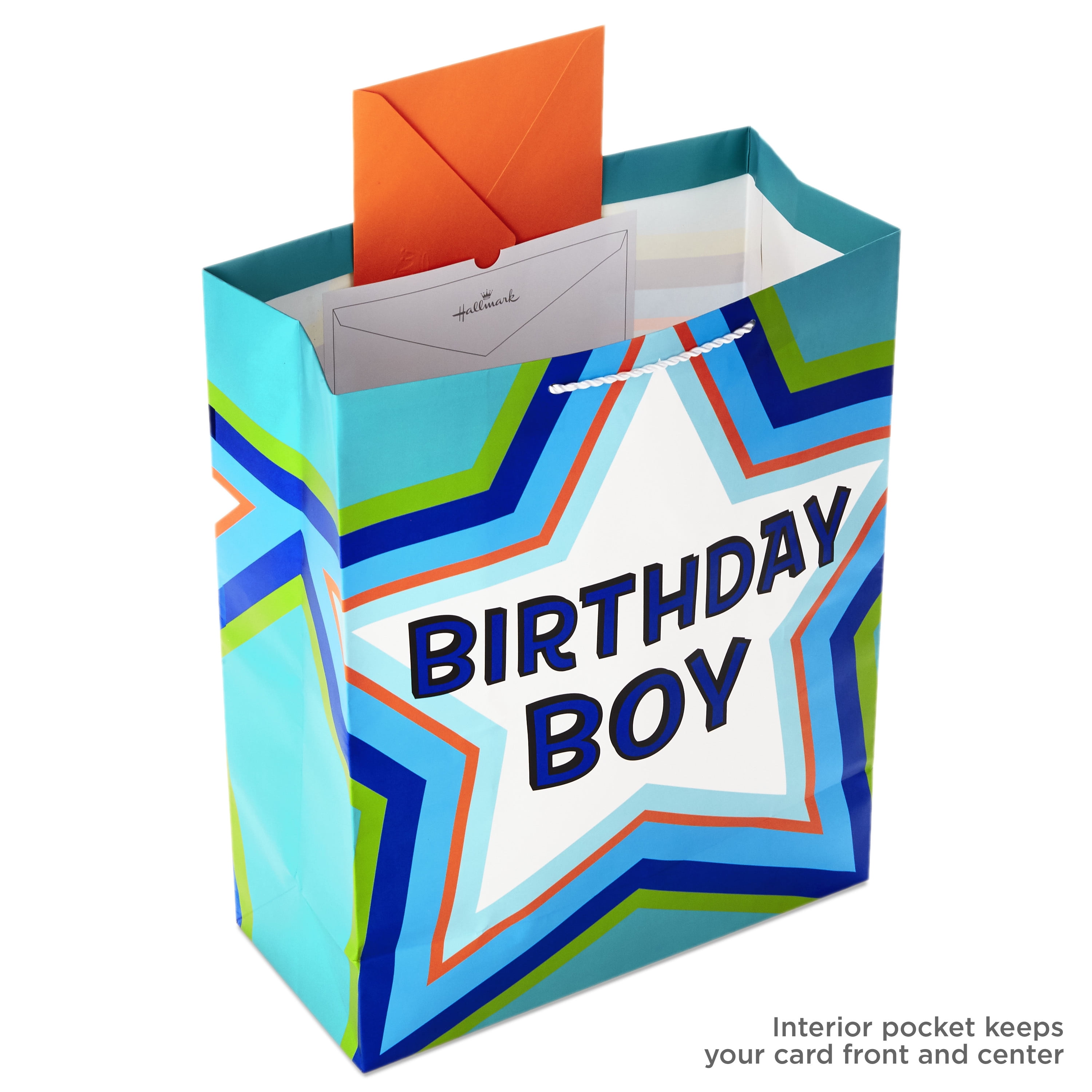- FESTIVE DESIGN: Celebrate the birthday boy with this bright and cheerful XL gift bag featuring a star outline in orange, blue and green with "Birthday Boy" lettering and blue foil accents.