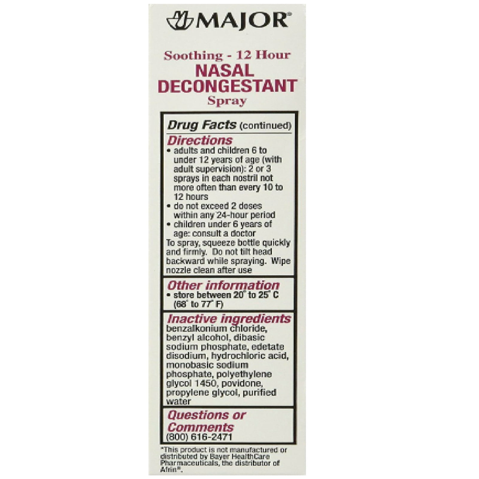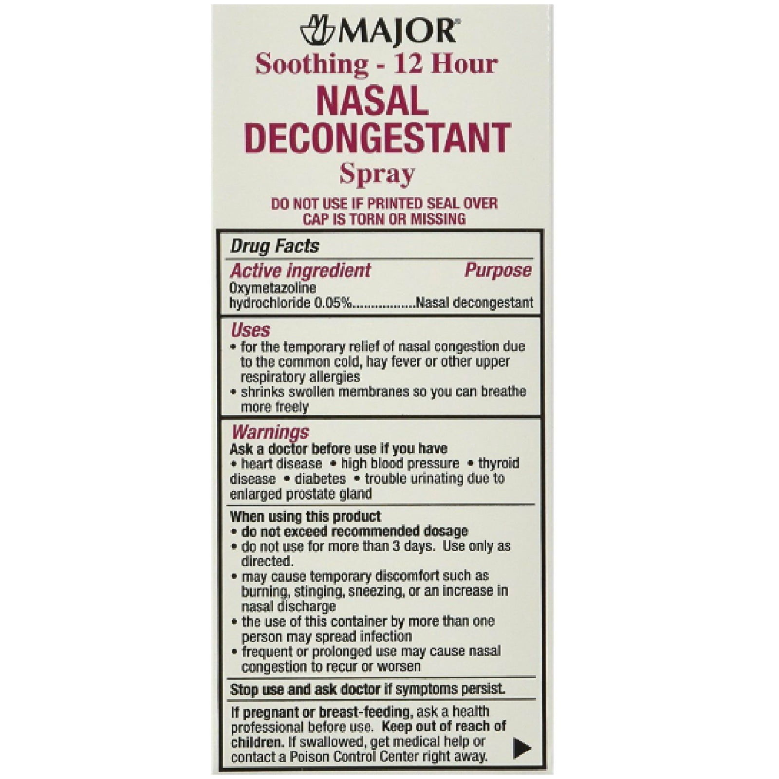 Major Oxymetazoline Hydrochloride 12Hr Nasal Congestion Relief, 1 oz, 2 Pack. Temporarily relieves nasal congestion due to: common cold, hay fever, and upper respiratory allergies. Temporarily relieves sinus congestion and pressure. Shrinks swollen nasal membranes so you can breathe more freely. This medication is used for temporary relief of congestion in the nose caused by various conditions including the common cold, sinusitis, hay fever, and allergies. It works by narrowing the blood vessels in the nose area, reducing swelling and congestion. They can help ease the symptoms of conditions such as colds and flu, hay fever and other allergic reactions, catarrh, and sinusitis.• They can help ease the symptoms of conditions such as colds and flu, hay fever, and other allergic reactions • Temporarily relieves nasal congestion due to: common cold, hay fever, upper respiratory allergies • This leads to constriction of the blood vessels in the nose, throat, and paranasal sinuses. • Major Oxymetazoline Hydrochloride 12Hr Nasal Congestion Relief, 1 oz, 2 Pack • Temporarily relieves sinus congestion and pressure