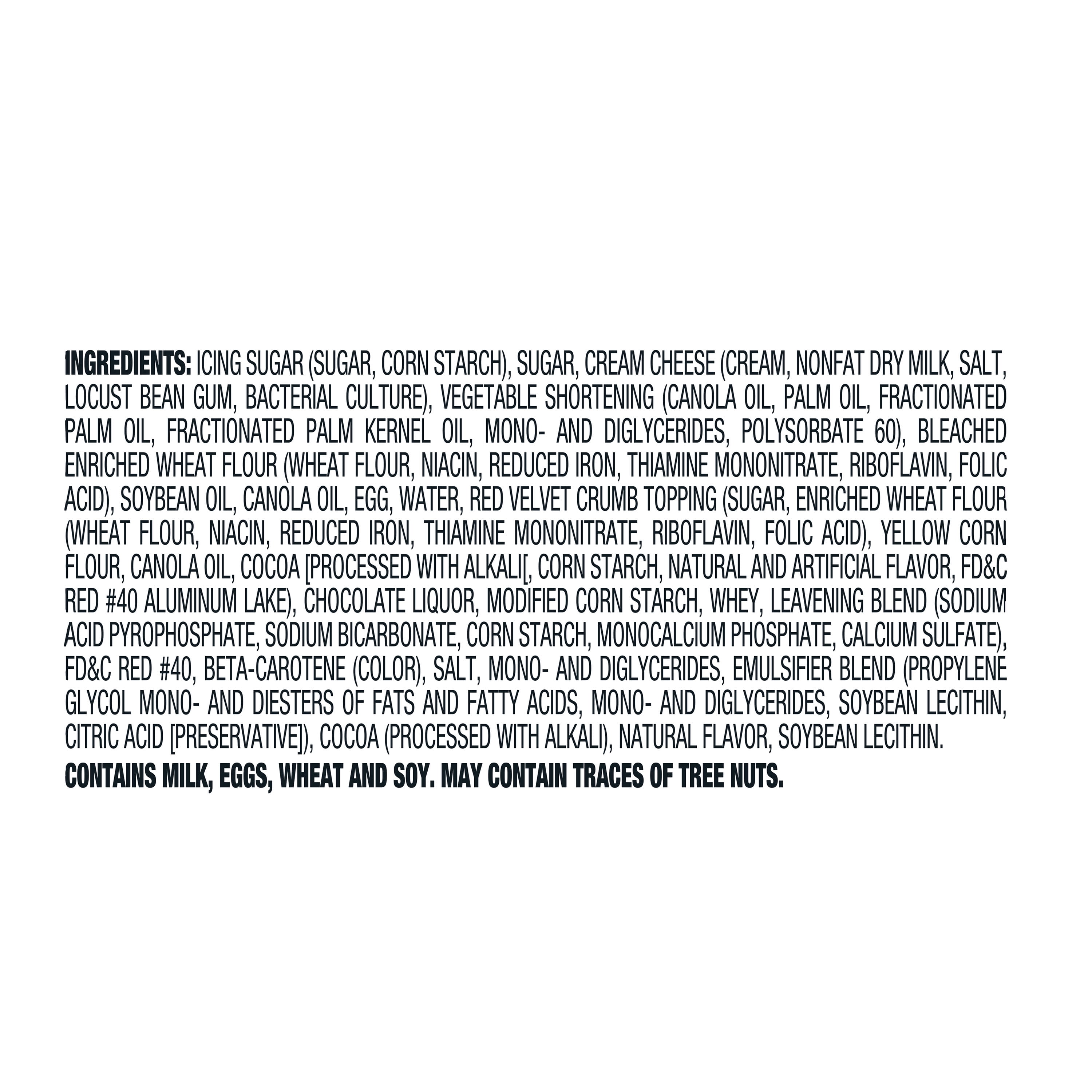 - Red velvet cake topped and filled with real cream cheese icing and red velvet crumbs