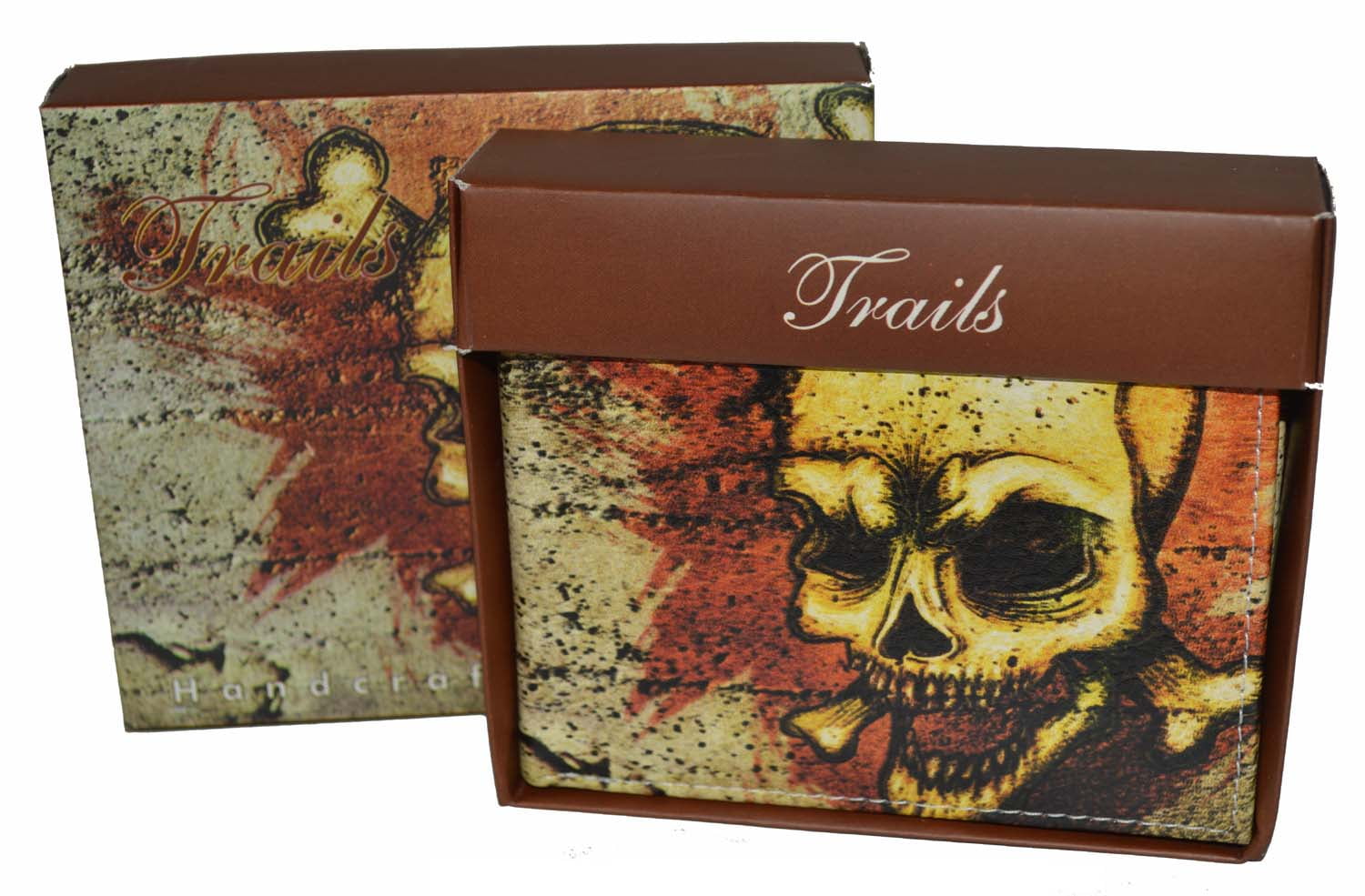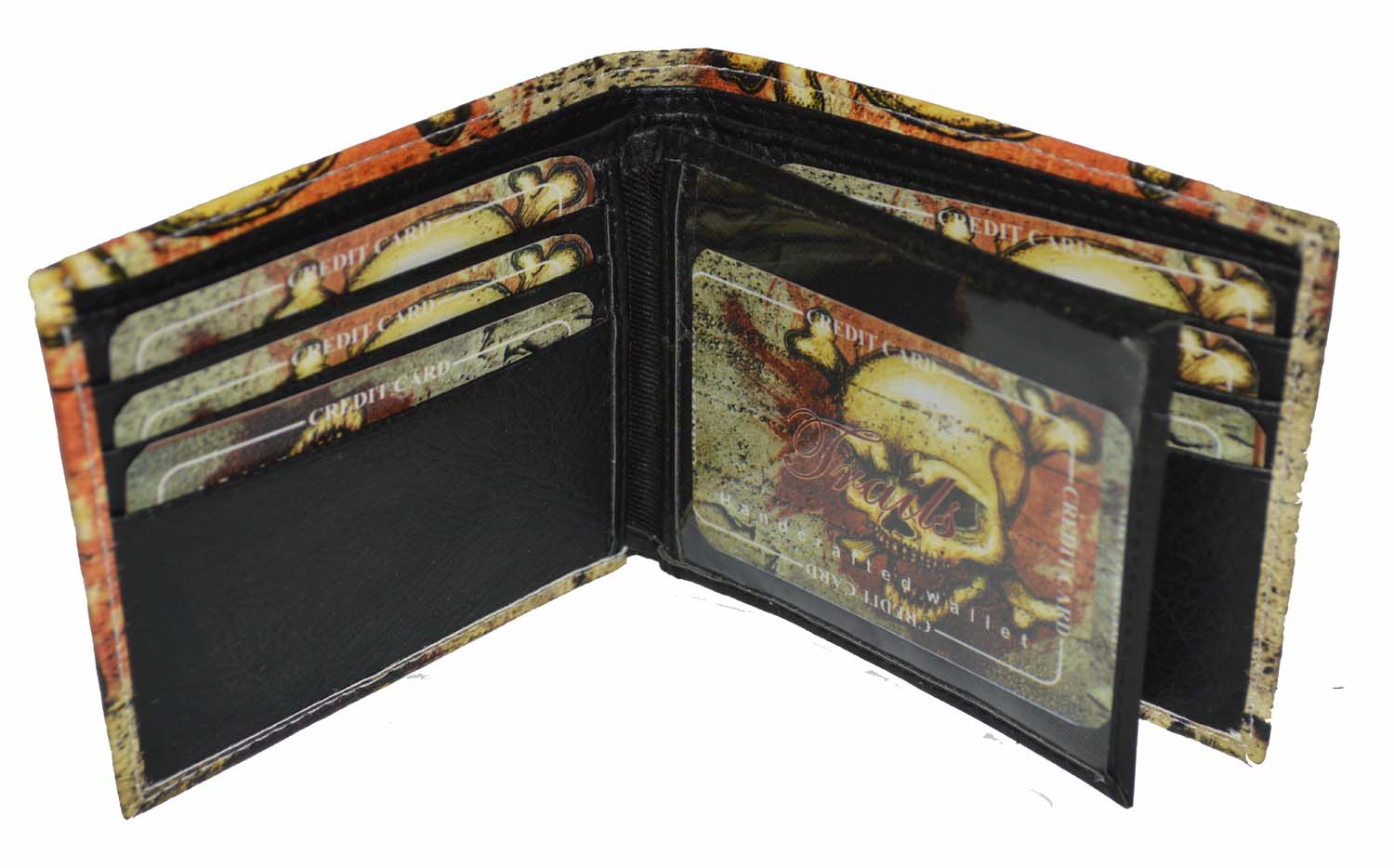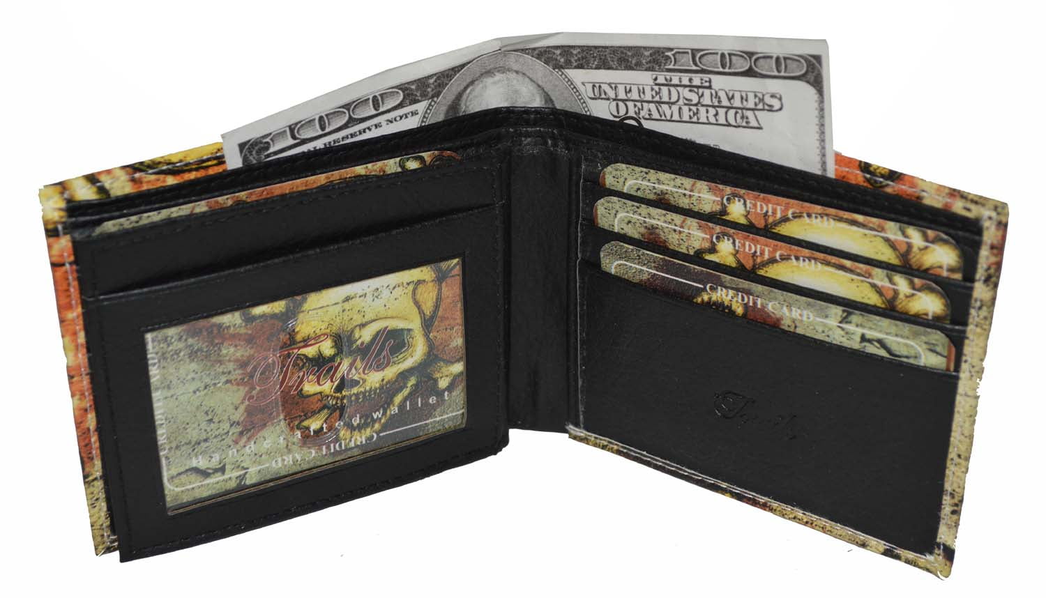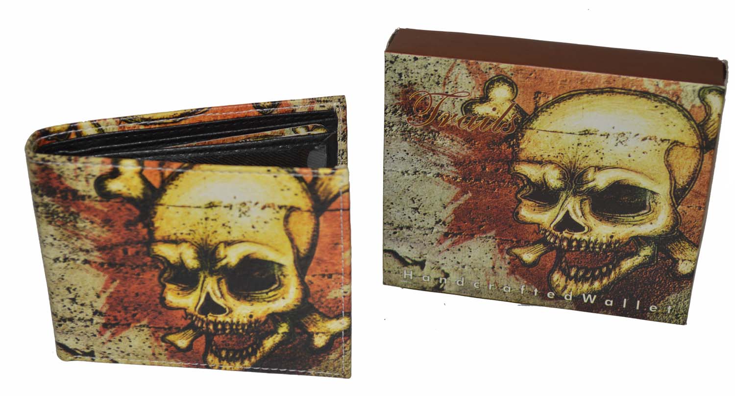 New Vegan Leather Designer Printed Wallets from Leatherboss. This stylish and beautifully printed wallet has 6 card slots, 2 picture ID windows, and 2 full size money pockets at the back. It has a beautiful skull design and it comes with a printed gift box as well. This wallet is a perfect gift idea for teens and all adult males for any occasion. It is approx. 4.7" x 4".Product Features