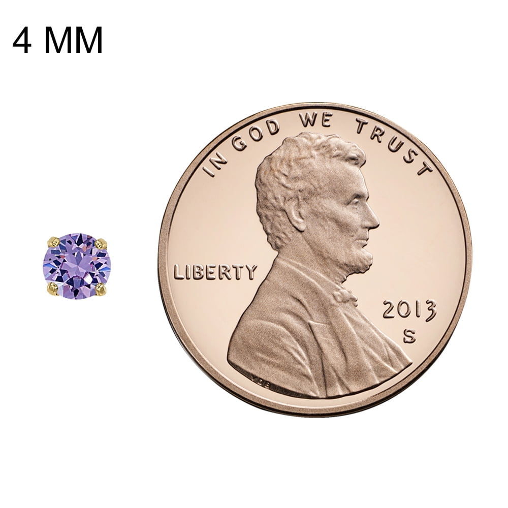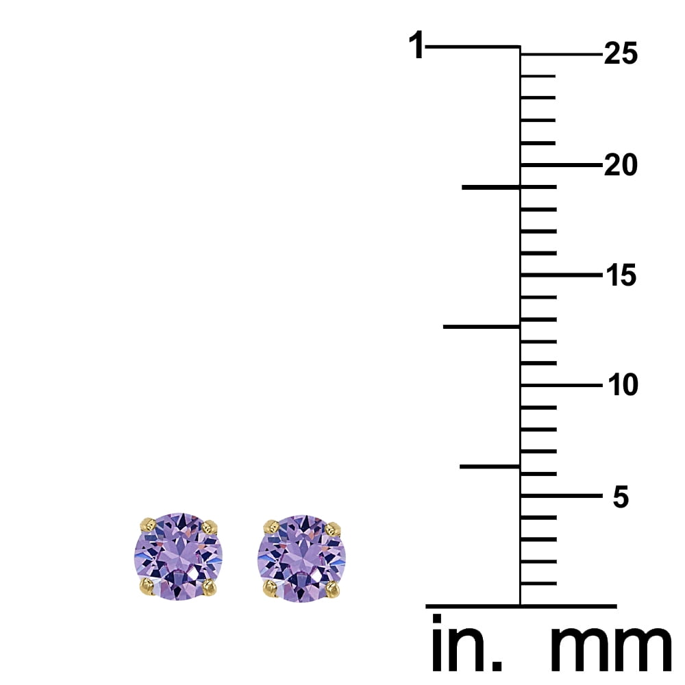 These classic solitaire earrings are crafted of 14-karat yellow gold and display stunning round-cut cubic zirconia measuring 4 mm. These earrings are equivalent to approximately 1/2 carats in diamond weight. The basket setting and screwback closures create a secure-wear earring stud. These earrings feature the birthstone color for June- alexandrite color – a unique light purple/pink hue.