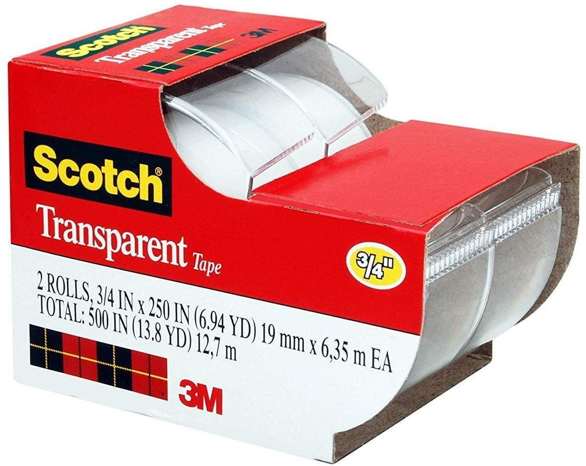 Scotch 2157ss 3/4" X 250" Scotch Transparent Tape 2 Count 6 pack 12 CountWhen you have a million and one things to do, there’s one tape to get-Scotch Transparent Tape. It’s clearly strong-holds things together in an instant; keeps things together for a long time. Clearly multi-purpose-ideal for all the jobs you need to get done. And clearly…clear-using 3M adhesive technology, it goes on transparently and won’t yellow with age. Scotch Transparent Tape Refills fit into all standard dispensers, glide off the roll smoothly, and cut easily-without wasted tape. Whatever you need to get done, wherever you are-home, work or school-Scotch Transparent Tape Refill Rolls are clearly ready to go to work.Classic glossy-finish. Ideal for multi-purpose sealing and label protection. Instant adhesion, excellent holding power. Crystal clear. Ideal on shiny surfaces. Pulls off the roll smoothly and cuts easily. Strong, secure, wont yellow with age. Photo safe. Made in the USA with globally sourced materials. Makes a great complement to decorative gift-wrapping paper. Easy-to-apply design that doesn’t dry out or yellow.