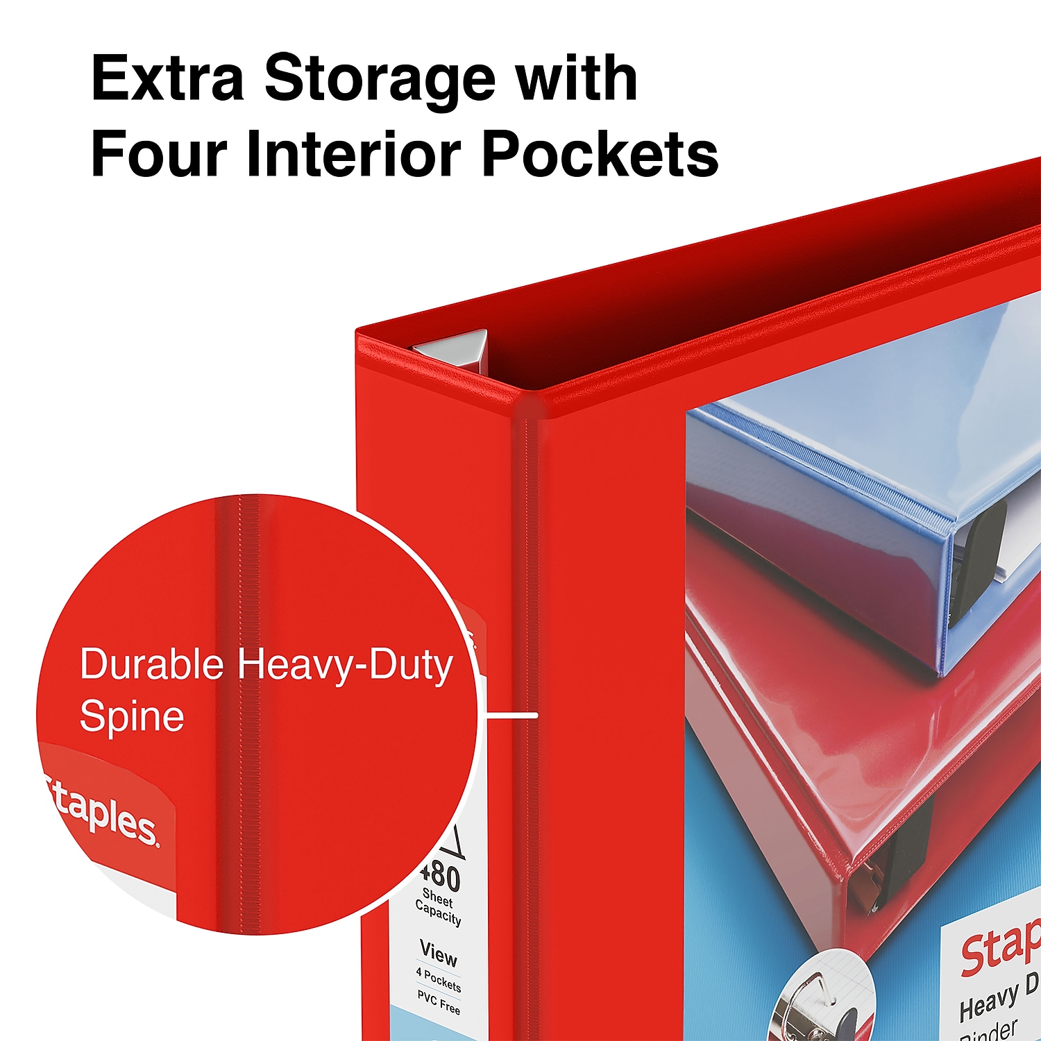 Keep documents organized and safe from the elements with this Staples heavy duty 2-inch D-ring view red binder.Secure sensitive business documents and keep paperwork organized with this heavy duty three-ring view binder. Ideal for storing important documents, this binder has an archive-safe, PVC-free plastic construction that preserves the integrity of stored documents and easily withstands wear and tear. This Staples heavy duty three-ring view binder boasts a 480-sheet capacity and offers additional storage for loose pages with four stacked inner pockets. Red heavy duty view binder is an excellent way to store spreadsheets and other papers. 2 inch binder. Three D-rings keep pages secure. Easy Locking Rings open with ease and keep pages secure. Holds up to 480 sheets. Durable covers are made of plastic with nonstick surface. Four interior pockets for added organization. Insert a custom spine label for easy identification. Accommodates 8.5" x 11" letter-sized papers. PVC free – made from plastics using fewer harmful chemicals and with reduced emissions during manufacturing. Sold as 1 Each.