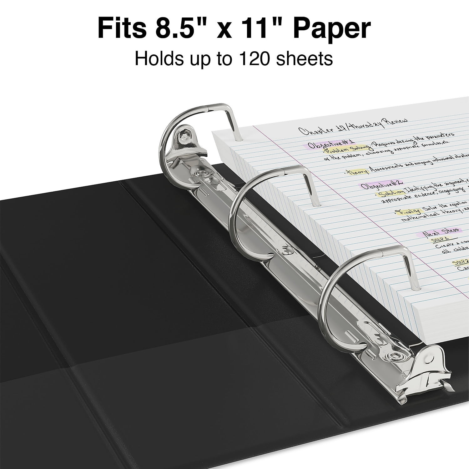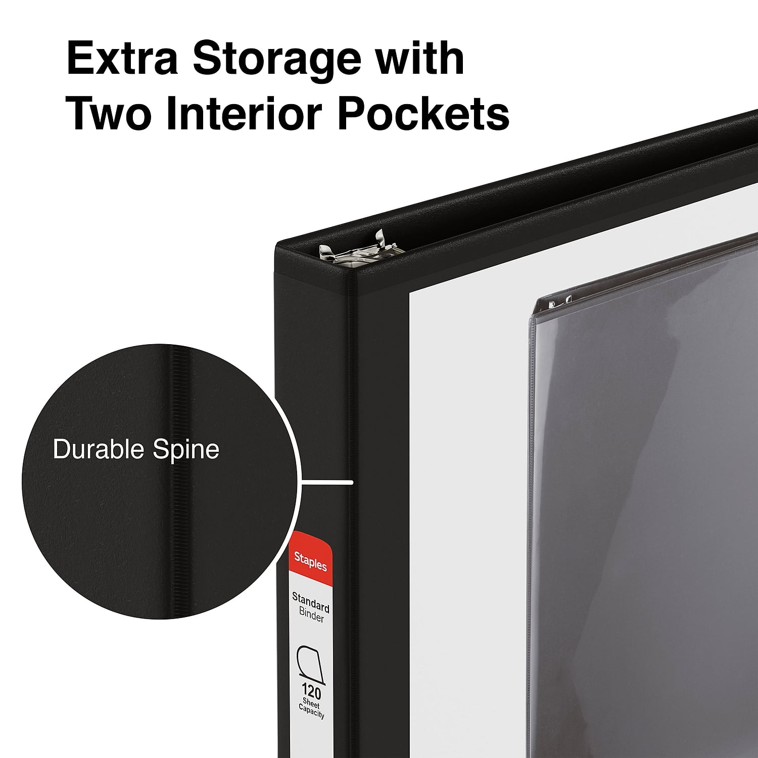 Keep documents secure and organized with this Staples Standard 120-sheet-capacity 1/2-inch D three-ring black view binder.Ensure documents are safe from spills and dirt with this black view binder. The D-rings let pages lie flat, so they are easy to read and write on, while the wide front and back panels keep standard dividers and sheet protectors covered. This Staples Standard view binder holds up to 120 pages and is nonstick, so ink and toner don’t smear. Black view binder is an excellent choice for storing spreadsheets and other wide papers. 1/2 inch binder. Three D-rings keep pages secure. Holds up to 120 sheets. Wide design accommodates letter-sized papers. Durable covers are made of plastic with nonstick surface. Two interior pockets for added organization. Insert a custom spine label for easy identification. PVC free – made from plastics using fewer harmful chemicals and with reduced emissions during manufacturing. Sold as 1 Each.