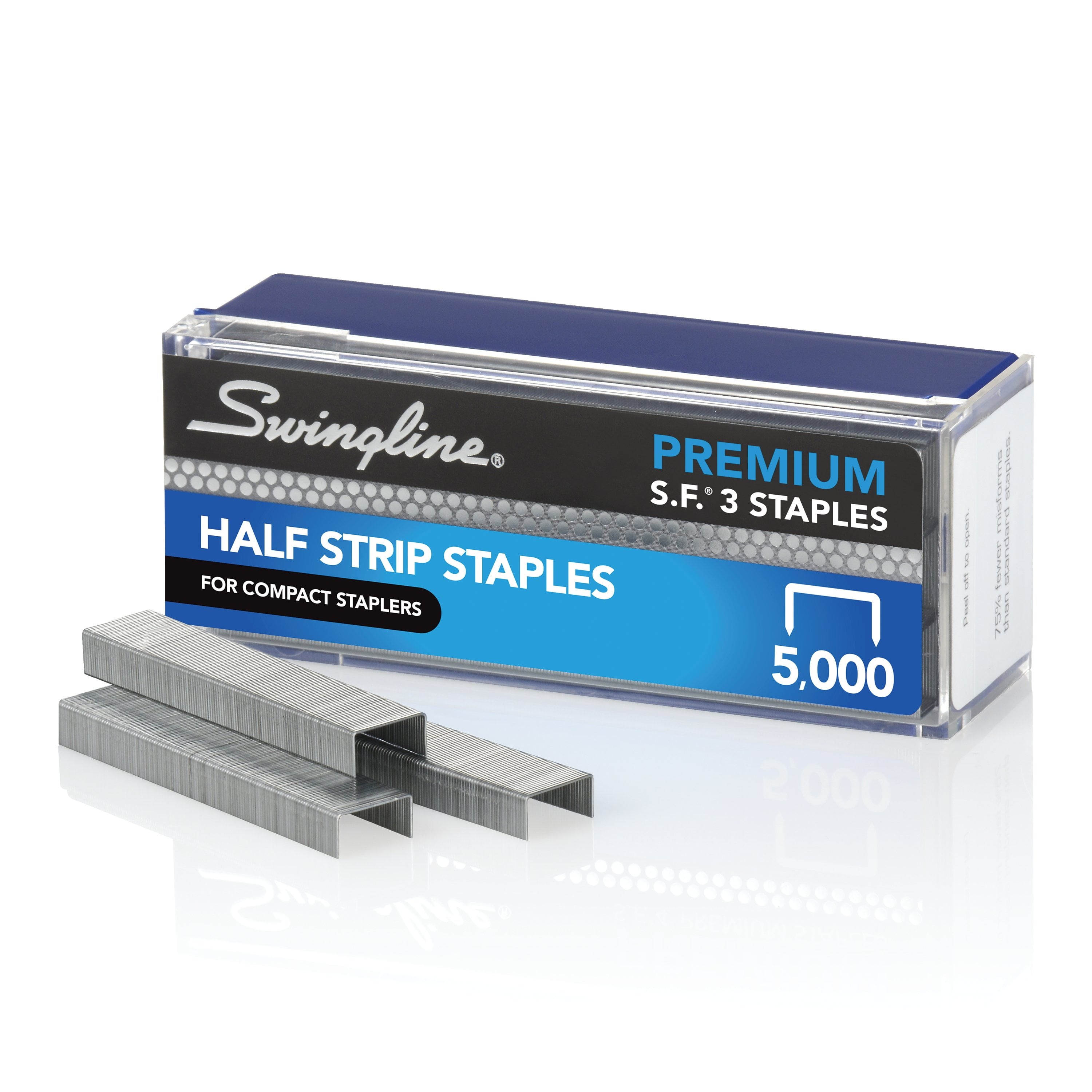 Swingline Standard Staples provide dependable, easy stapling performance. The precision engineered chisel point pierces paper cleanly without jamming and provides secure paper fastening. Dependable Swingline staplers staples for 75% fewer misforms than the competition. These standard staples are used with compact/half strip staplers. Each box contains 5,000 staples in a reusable storage box, 1/4" leg length, and each half strip contains 105 staples per strip. Include 5 boxes per pack.