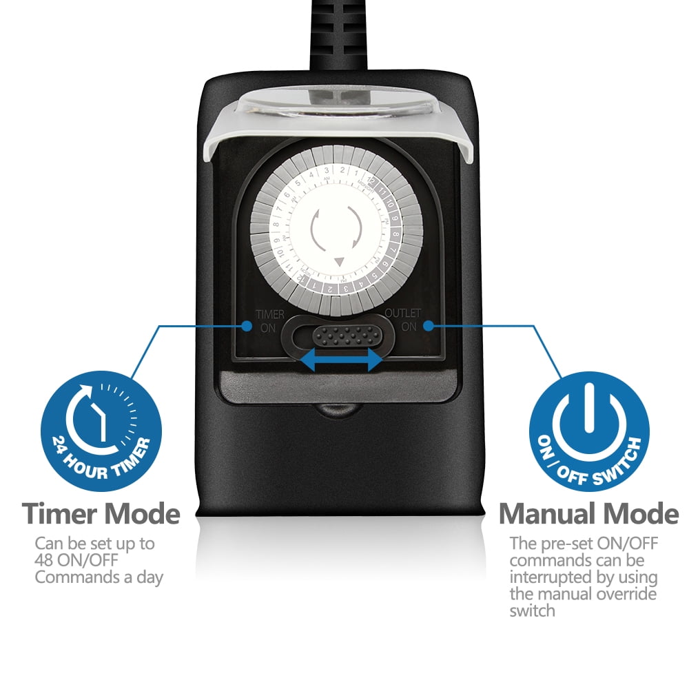 Timer Outlet Outdoor, Kasonic 24 Hour Mechanical Timer Switch, Heavy Duty Water Resistance with 2 Grounded Outlet, ETL Listed (Black)